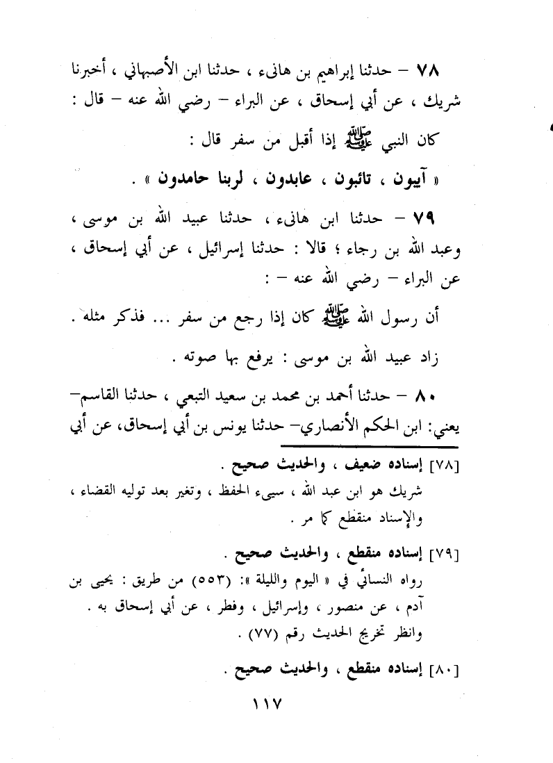 79 - حَدَّثَنَا ابْنُ هَانِئٍ، حَدَّثَنَا عُبَيْدُ اللَّهِ بْنُ مُوسَى، وَعَبْدُ اللَّهِ بْنُ رَجَاءٍ قَالَا: حَدَّثَنَا إِسْرَائِيلُ، عَنْ أَبِي إِسْحَاقَ، عَنِ الْبَرَاءِ، رَضِيَ اللَّهُ عَنْهُ أَنَّ رَسُولَ اللَّهِ صَلَّى اللهُ عَلَيْهِ وَسَلَّمَ كَانَ إِذَا رَجَعَ مِنْ سَفَرٍ فَذَكَرَ مِثْلَهُ زَادَ عُبَيْدُ اللَّهِ بْنُ مُوسَى: يَرْفَعُ بِهَا صَوْتَهُ
