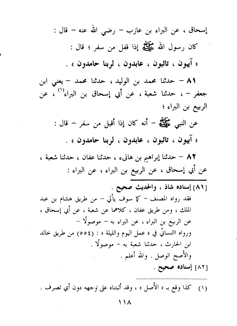 81 - حَدَّثَنَا مُحَمَّدُ بْنُ الْوَلِيدِ، حَدَّثَنَا مُحَمَّدٌ يَعْنِي ابْنَ جَعْفَرٍ، حَدَّثَنَا شُعْبَةُ، عَنْ أَبِي إِسْحَاقَ بْنِ الْبَرَاءِ، عَنِ الرَّبِيعِ بْنِ الْبَرَاءِ، عَنِ النَّبِيِّ صَلَّى اللهُ عَلَيْهِ وَسَلَّمَ أَنَّهُ كَانَ إِذَا أَقْبَلَ مِنْ سَفَرٍ قَالَ: «§آيِبُونَ، تَائِبُونَ، عَابِدُونَ، لِرَبِّنَا حَامِدُونَ»