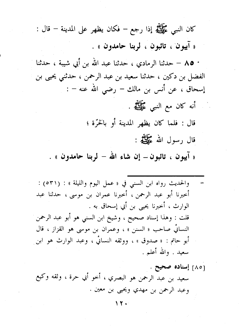 85 - حَدَّثَنَا الرَّمَادِيُّ، حَدَّثَنَا عَبْدُ اللَّهِ بْنُ أَبِي شَيْبَةَ، حَدَّثَنَا الْفَضْلُ بْنُ دُكَيْنٍ، حَدَّثَنَا سَعِيدُ بْنُ عَبْدِ الرَّحْمَنِ، حَدَّثَنِي يَحْيَى بْنُ إِسْحَاقَ، عَنْ أَنَسِ بْنِ مَالِكٍ، رَضِيَ اللَّهُ عَنْهُ أَنَّهُ كَانَ مَعَ النَّبِيِّ صَلَّى اللهُ عَلَيْهِ وَسَلَّمَ قَالَ: فَلَمَّا كَانَ يَظْهَرُ الْمَدِينَةَ أَوْ بِالْحَرَّةِ قَالَ رَسُولُ اللَّهِ صَلَّى اللهُ عَلَيْهِ وَسَلَّمَ: «§آيِبُونَ، تَائِبُونَ، إِنْ شَاءَ اللَّهُ، لِرَبِّنَا حَامِدُونَ»