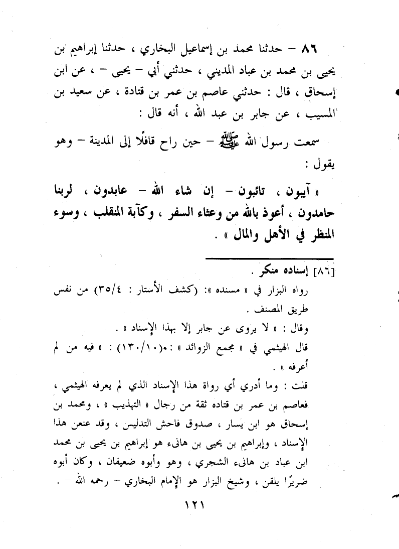 86 - حَدَّثَنَا مُحَمَّدُ بْنُ إِسْمَاعِيلَ الْبُخَارِيُّ، حَدَّثَنَا إِبْرَاهِيمُ بْنُ يَحْيَى بْنِ مُحَمَّدِ بْنِ عَبَّادٍ الْمَدِينِيُّ، حَدَّثَنِي أَبِي يَحْيَى، عَنِ ابْنِ إِسْحَاقَ قَالَ: حَدَّثَنِي عَاصِمُ بْنُ عُمَرَ بْنِ قَتَادَةَ، عَنْ سَعِيدِ بْنِ الْمُسَيِّبِ، عَنْ جَابِرِ بْنِ عَبْدِ اللَّهِ، أَنَّهُ قَالَ سَمِعْتُ رَسُولَ اللَّهِ صَلَّى اللهُ عَلَيْهِ وَسَلَّمَ حِينَ رَاحَ قَافِلًا إِلَى الْمَدِينَةِ وَهُوَ يَقُولُ: «§آيِبُونَ، تَائِبُونَ إِنْ شَاءَ اللَّهُ، عَابِدُونَ، لِرَبِّنَا حَامِدُونَ، أَعُوذُ بِاللَّهِ مِنْ وَعْثَاءِ السَّفَرِ، وَكَآبَةِ الْمُنْقَلَبِ، وَسُوءِ الْمَنْظَرِ فِي الْأَهْلِ وَالْمَالِ»