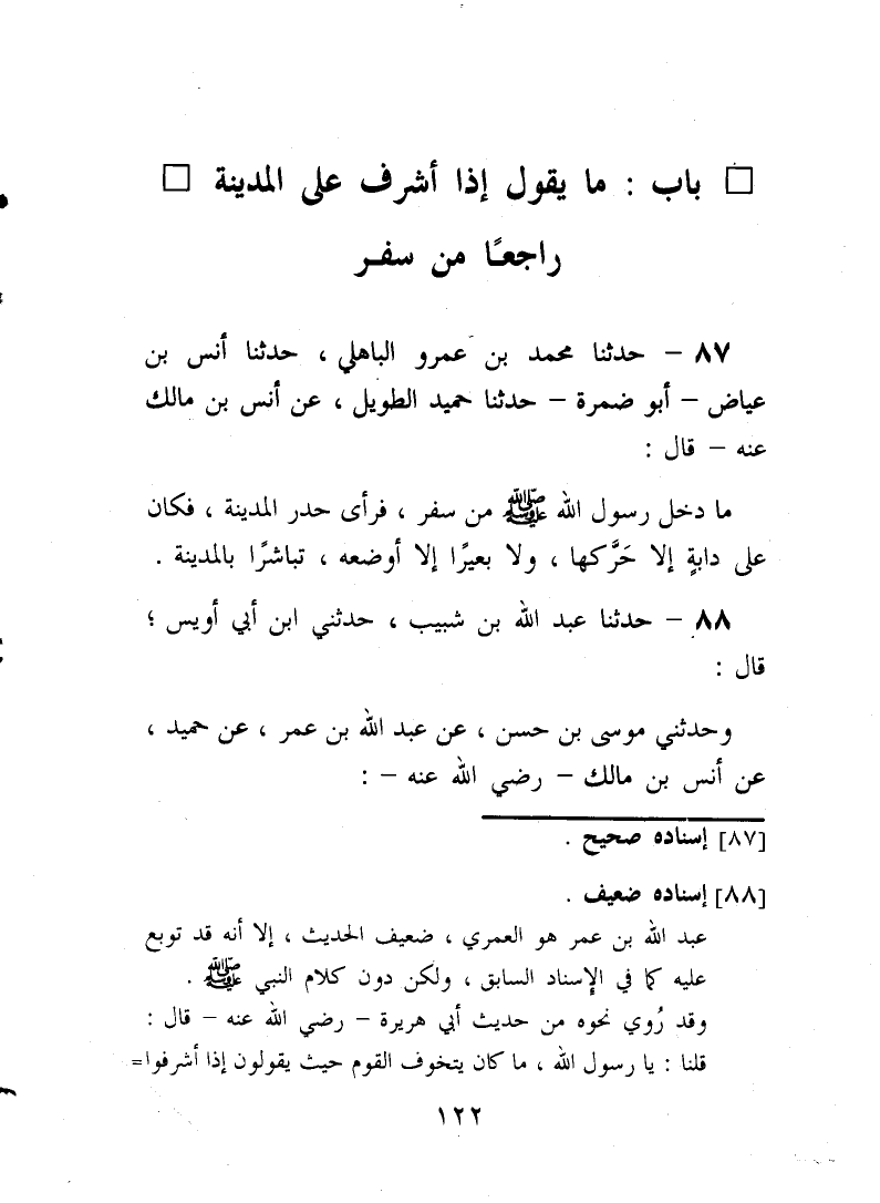 87 - حَدَّثَنَا مُحَمَّدُ بْنُ عَمْرٍو الْبَاهِلِيُّ، حَدَّثَنَا أَنَسُ بْنُ عِيَاضٍ أَبُو ضَمْرَةَ حَدَّثَنَا حُمَيْدٌ الطَّوِيلُ، عَنْ أَنَسِ بْنِ مَالِكٍ، عَنْهُ قَالَ: " §مَا دَخَلَ رَسُولُ اللَّهِ صَلَّى اللهُ عَلَيْهِ وَسَلَّمَ مِنْ سَفَرٍ، فَرَأَى حَدْرَ الْمَدِينَةِ، فَكَانَ عَلَى دَابَّةٍ إِلَّا حَرَّكَهَا، وَلَا بَعِيرًا إِلَّا أَوْضَعَهُ، تَبَاشُرًا بِالْمَدِينَةِ