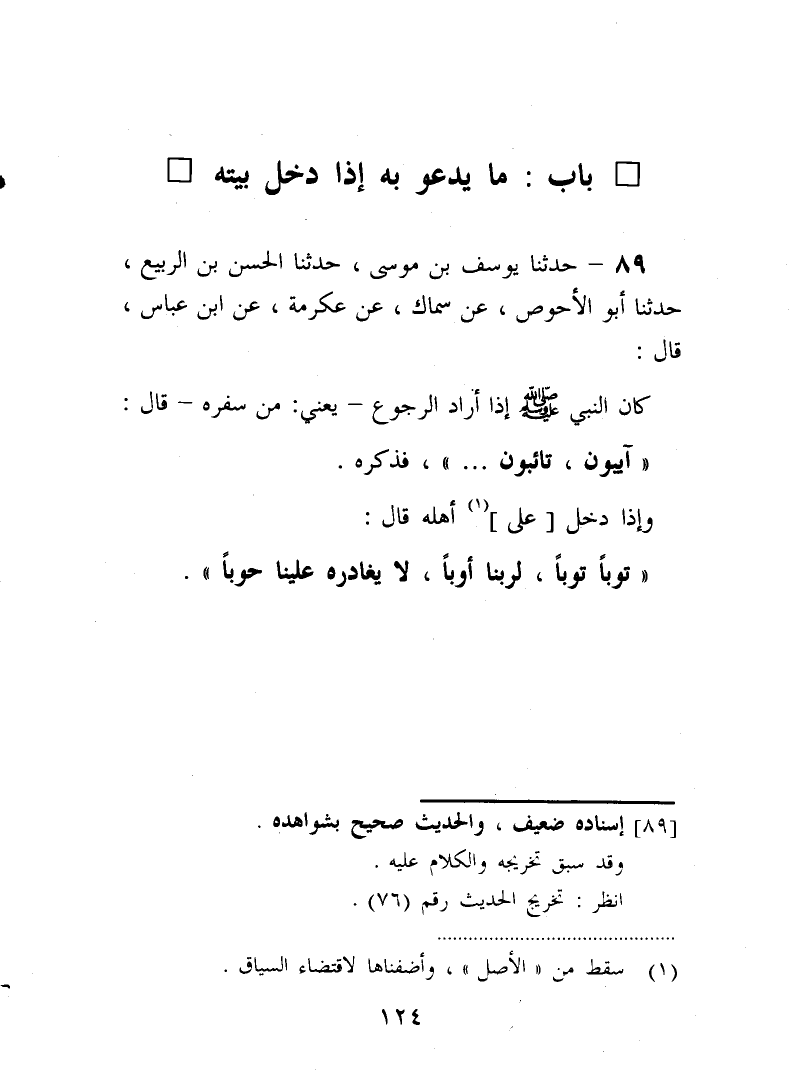 89 - حَدَّثَنَا يُوسُفُ بْنُ مُوسَى، حَدَّثَنَا الْحَسَنُ بْنُ الرَّبِيعِ، حَدَّثَنَا أَبُو الْأَحْوَصِ، عَنْ سِمَاكٍ، عَنْ عِكْرِمَةَ، عَنِ ابْنِ عَبَّاسٍ قَالَ: كَانَ النَّبِيُّ صَلَّى اللهُ عَلَيْهِ وَسَلَّمَ إِذَا أَرَادَ الرُّجُوعَ يَعْنِي مِنْ سَفَرِهِ قَالَ: «آيِبُونَ، تَائِبُونَ» فَذَكَرَهُ، وَإِذَا دَخَلَ عَلَى أَهْلِهِ قَالَ: «§تَوْبًا، تَوْبًا، لِرَبِّنَا أَوْبًا، لَا يُغَادِرُهُ عَلَيْنَا حَوْبًا»