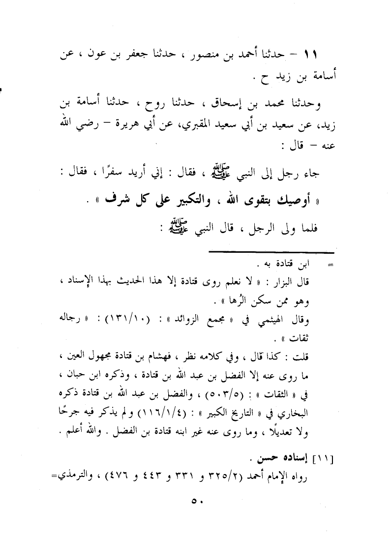 11 - حَدَّثَنَا أَحْمَدُ بْنُ مَنْصُورٍ، حَدَّثَنَا جَعْفَرُ بْنُ عَوْنٍ، عَنْ أُسَامَةَ بْنِ زَيْدٍ، ح وَحَدَّثَنَا مُحَمَّدُ بْنُ إِسْحَاقَ، حَدَّثَنَا رَوْحٌ، حَدَّثَنَا أُسَامَةُ بْنُ زَيْدٍ، عَنْ سَعِيدِ بْنِ أَبِي سَعِيدٍ الْمَقْبُرِيِّ، عَنْ أَبِي هُرَيْرَةَ رَضِيَ اللَّهُ عَنْهُ قَالَ: جَاءَ رَجُلٌ إِلَى النَّبِيِّ صَلَّى اللهُ عَلَيْهِ وَسَلَّمَ، فَقَالَ: إِنِّي أُرِيدُ سَفَرًا، فَقَالَ: «§أُوصِيكَ بِتَقْوَى اللَّهِ، وَالتَّكْبِيرِ عَلَى كُلِّ شَرَفٍ» فَلَمَّا وَلَّى الرَّجُلُ قَالَ: النَّبِيُّ صَلَّى اللهُ عَلَيْهِ وَسَلَّمَ: -[51]- «اللَّهُمَّ ازْوِ لَهُ الْأَرْضَ، وَهَوِّنْ عَلَيْهِ السَّفَرَ»