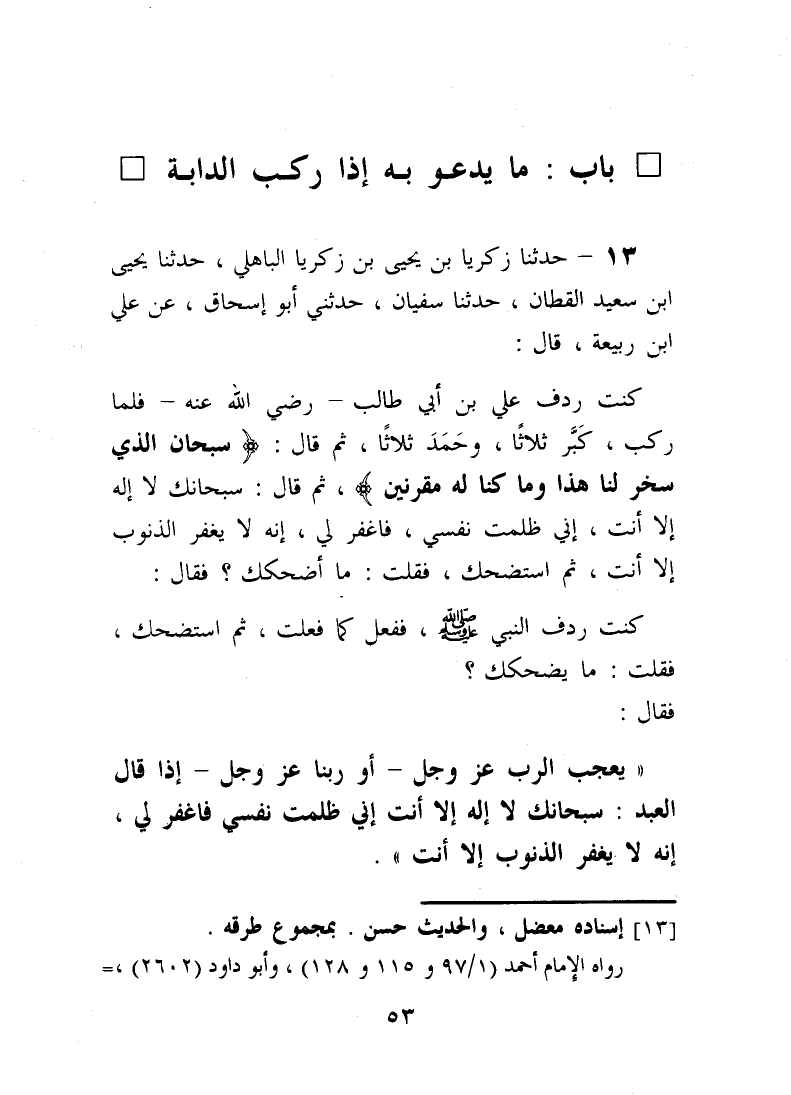 13 - حَدَّثَنَا زَكَرِيَّا بْنُ يَحْيَى بْنِ زَكَرِيَّا الْبَاهِلِيُّ، حَدَّثَنَا يَحْيَى بْنُ سَعِيدٍ الْقَطَّانُ، حَدَّثَنَا سُفْيَانُ، حَدَّثَنِي أَبُو إِسْحَاقَ، عَنْ عَلِيِّ بْنِ رَبِيعَةَ قَالَ: كُنْتُ رِدْفَ عَلِيِّ بْنِ أَبِي طَالِبٍ رَضِيَ اللَّهُ عَنْهُ، فَلَمَّا رَكِبَ، كَبَّرَ ثَلَاثًا، وَحَمِدَ ثَلَاثًا، ثُمَّ قَالَ: سُبْحَانَ الَّذِي سَخَّرَ لَنَا هَذَا وَمَا كُنَّا لَهُ مُقْرِنِينَ، ثُمَّ قَالَ: سُبْحَانَ اللَّهِ، لَا إِلَهَ إِلَّا أَنْتَ، إِنِّي ظَلَمْتُ نَفْسِيَ، فَاغْفِرْ لِي، إِنَّهُ لَا يَغْفِرُ الذُّنُوبَ إِلَّا أَنْتَ، ثُمَّ اسْتَضْحَكَ، فَقُلْتُ: مَا أَضْحَكَكَ؟ فَقَالَ: كُنْتُ رِدْفَ النَّبِيِّ صَلَّى اللهُ عَلَيْهِ وَسَلَّمَ، فَفَعَلَ كَمَا فَعَلْتُ، ثُمَّ اسْتَضْحَكَ، فَقُلْتُ: مَا يُضْحِكُكَ؟ فَقَالَ: " §يَعْجَبُ الرَّبُّ عَزَّ وَجَلَّ - أَوْ رَبُّنَا عَزَّ وَجَلَّ - إِذَا قَالَ الْعَبْدُ: سُبْحَانَكَ لَا إِلَهَ إِلَّا أَنْتَ إِنِّي ظَلَمْتُ نَفْسِيَ، فَاغْفِرْ لِي، إِنَّهُ لَا يَغْفِرُ الذُّنُوبَ إِلَّا أَنْتَ "