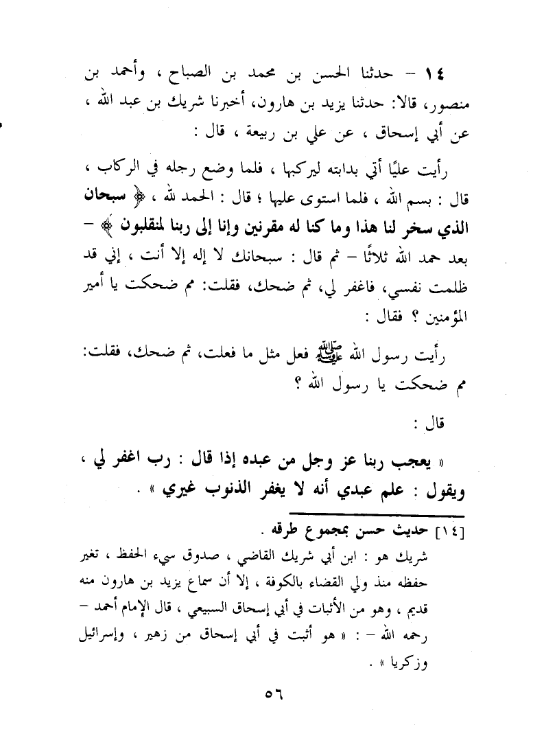 14 - حَدَّثَنَا الْحَسَنُ بْنُ مُحَمَّدِ بْنِ الصَّبَّاحِ، وَأَحْمَدُ بْنُ مَنْصُورٍ قَالَا: حَدَّثَنَا يَزِيدُ بْنُ هَارُونَ، أَخْبَرَنَا شَرِيكُ بْنُ عَبْدِ اللَّهِ، عَنْ أَبِي إِسْحَاقَ، عَنْ عَلِيِّ بْنِ رَبِيعَةَ قَالَ: رَأَيْتُ عَلِيًّا أَتَيَ بِدَابَّتِهِ لِيَرْكَبَهَا، فَلَمَّا وَضَعَ رِجْلَهُ فِي الرِّكَابِ قَالَ: بِسْمِ اللَّهِ، فَلَمَّا اسْتَوَى عَلَيْهَا قَالَ: الْحَمْدُ لِلَّهِ، سُبْحَانَ الَّذِي سَخَّرَ لَنَا هَذَا وَمَا كُنَّا لَهُ مُقْرِنِينَ، وَإِنَّا إِلَى رَبِّنَا لَمُنْقَلِبُونَ - بَعْدَ حَمْدِ اللَّهِ ثَلَاثًا - قَالَ: سُبْحَانَكَ لَا إِلَهَ إِلَّا أَنْتَ، إِنِّي قَدْ ظَلَمْتُ نَفْسِيَ، فَاغْفِرْ لِي، ثُمَّ ضَحِكَ، فَقُلْتُ: مِمَّ ضَحِكْتَ يَا أَمِيرَ الْمُؤْمِنِينَ؟ فَقَالَ: رَأَيْتُ رَسُولَ اللَّهِ صَلَّى اللهُ عَلَيْهِ وَسَلَّمَ فَعَلَ مَا فَعَلْتَ، ثُمَّ ضَحِكَ، فَقُلْتُ: مِمَّ ضَحِكْتَ يَا رَسُولَ اللَّهِ؟ قَالَ: " §يَعْجَبُ رَبُّنَا عَزَّ وَجَلَّ مِنْ عَبْدِهِ إِذَا قَالَ: رَبِّ اغْفِرْ لِي، وَيَقُولُ: عَلِمَ عَبْدِي أَنَّهُ لَا يَغْفِرُ الذُّنُوبَ غَيْرِي "