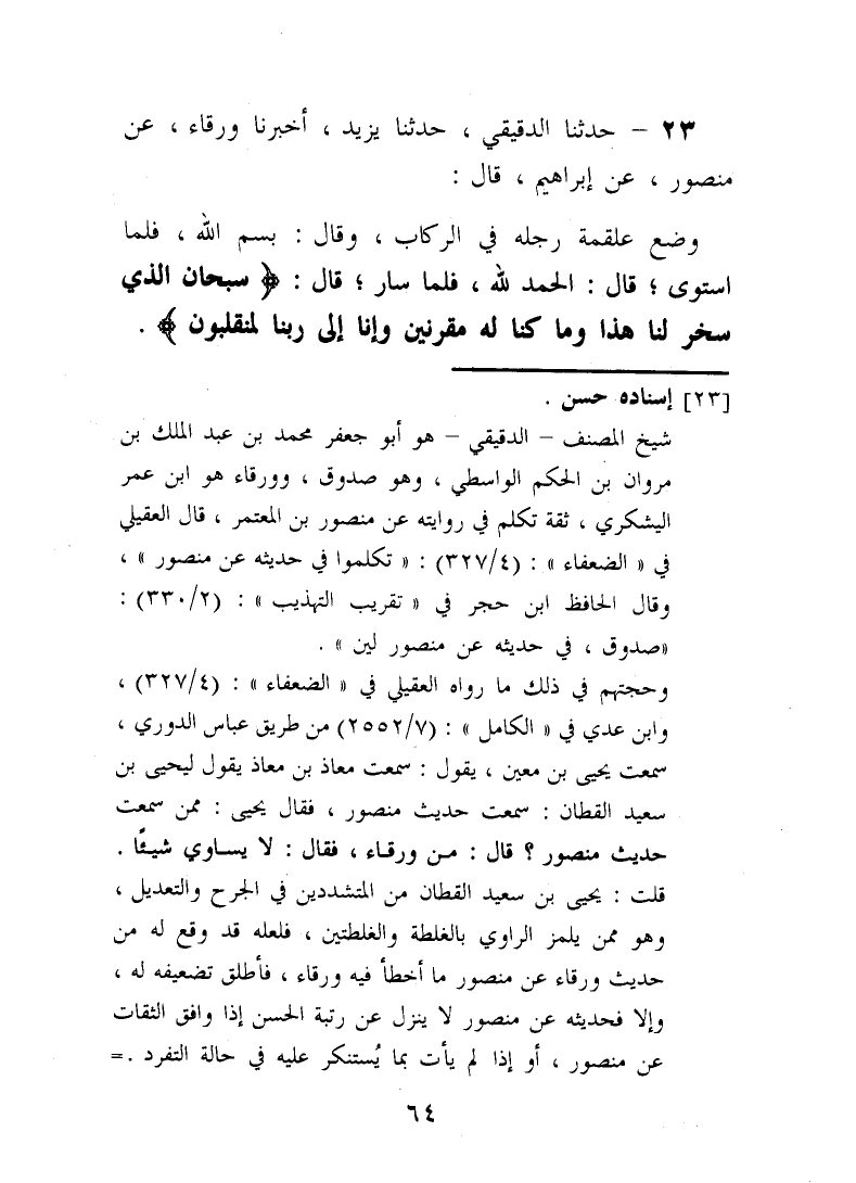23 - حَدَّثَنَا الدَّقِيقِيُّ، حَدَّثَنَا يَزِيدُ، أَخْبَرَنَا وَرْقَاءُ، عَنْ مَنْصُورٍ، عَنْ إِبْرَاهِيمَ قَالَ: وَضَعَ عَلْقَمَةُ رِجْلَهُ فِي الرِّكَابِ، وَقَالَ: «بِسْمِ اللَّهِ» ، فَلَمَّا اسْتَوَى قَالَ: «الْحَمْدُ لِلَّهِ» ، فَلَمَّا سَارَ؛ قَالَ: «§سُبْحَانَ الَّذِي سَخَّرَ لَنَا هَذَا وَمَا كُنَّا لَهُ مُقْرِنِينَ وَإِنَّا إِلَى رَبِّنَا لَمُنْقَلِبُونَ»