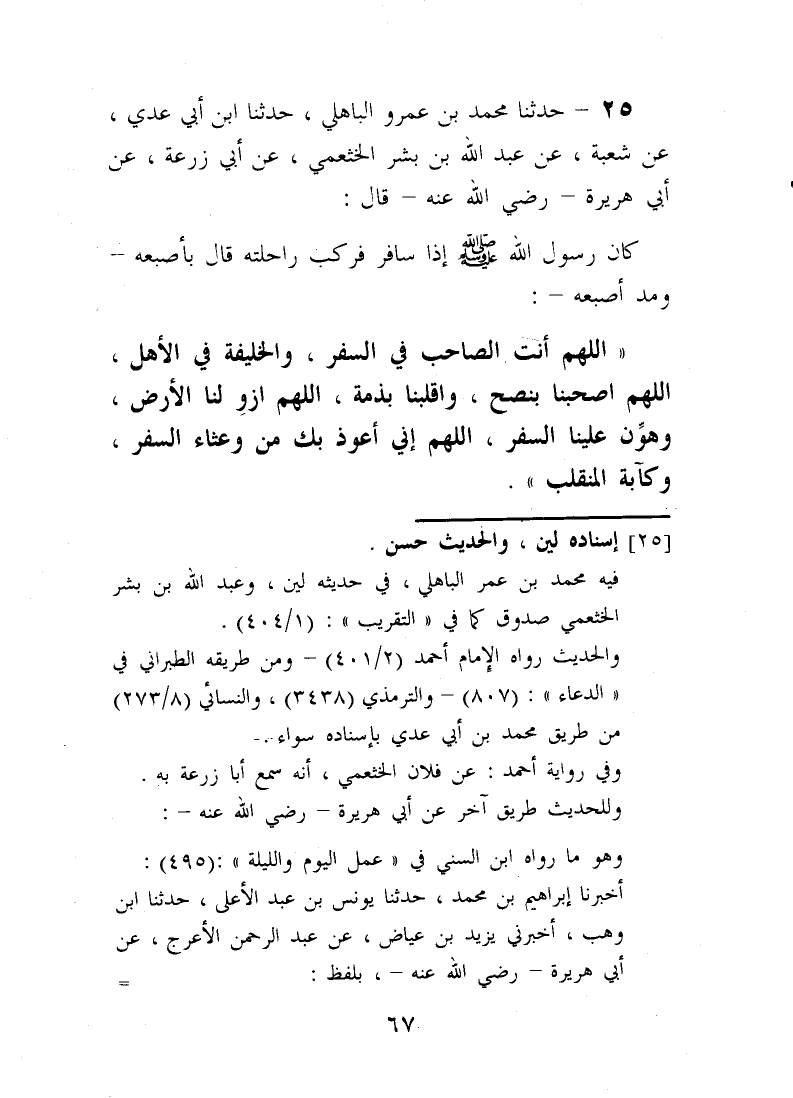 25 - حَدَّثَنَا مُحَمَّدُ بْنُ عَمْرٍو الْبَاهِلِيُّ، حَدَّثَنَا ابْنُ أَبِي عَدِيٍّ، عَنْ شُعْبَةَ، عَنْ عَبْدِ اللَّهِ بْنِ بِشْرٍ الْخَثْعَميِّ، عَنْ أَبِي زُرْعَةَ، عَنْ أَبِي هُرَيْرَةَ رَضِيَ اللَّهُ عَنْهُ قَالَ: كَانَ رَسُولُ اللَّهِ صَلَّى اللهُ عَلَيْهِ وَسَلَّمَ إِذَا سَافَرَ فَرَكِبَ رَاحِلَتَهُ قَالَ: بِإِصْبُعِهِ - وَمَدَّ إِصْبُعَهُ -: «اللَّهُمَّ §أَنْتَ الصَّاحِبُ فِي السَّفَرِ، وَالْخَلِيفَةُ فِي الْأَهْلِ، اللَّهُمَّ اصْحَبْنَا بِنُصْحٍ، وَاقْلِبْنَا بِذِمَّةٍ، اللَّهُمَّ ازْوِ لَنَا الْأَرْضَ، وَهَوِّنْ عَلَيْنَا السَّفَرَ، اللَّهُمَّ إِنِّي أَعُوذُ بِكَ مِنْ وَعْثَاءِ السَّفَرِ، وَكَآبَةِ الْمُنْقَلَبِ»