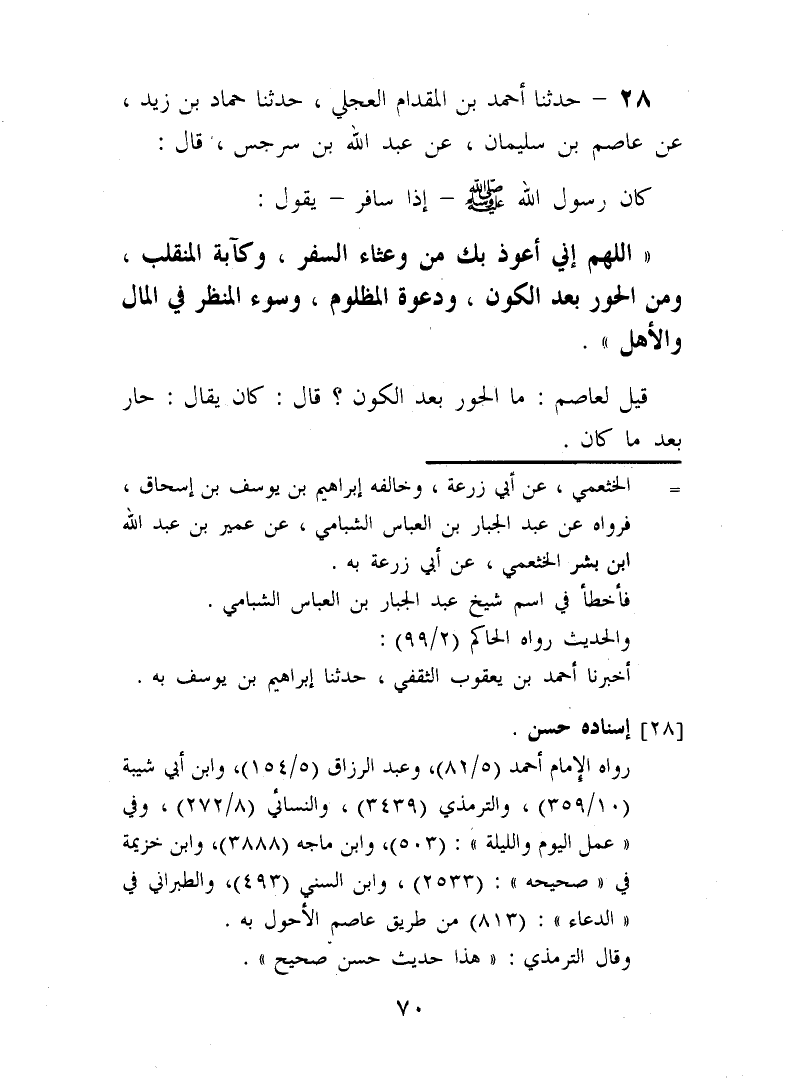 28 - حَدَّثَنَا أَحْمَدُ بْنُ الْمِقْدَامِ الْعِجْلِيُّ، حَدَّثَنَا حَمَّادُ بْنُ زَيْدٍ، عَنْ عَاصِمِ بْنِ سُلَيْمَانَ، عَنْ عَبْدِ اللَّهِ بْنِ سَرْجِسٍ قَالَ: كَانَ رَسُولُ اللَّهِ صَلَّى اللهُ عَلَيْهِ وَسَلَّمَ إِذَا سَافَرَ يَقُولُ: «اللَّهُمَّ إِنِّي §أَعُوذُ بِكَ مِنْ وَعْثَاءِ السَّفَرِ، وَكَآبَةِ الْمُنْقَلَبِ، وَمِنَ الْحَوْرِ بَعْدَ الْكَوْنِ، وَدَعْوَةِ الْمَظْلُومِ، وَسُوءِ الْمَنْظَرِ فِي الْمَالِ وَالْأَهْلِ» قِيلَ لِعَاصِمٍ: مَا الْحَوْرُ بَعْدَ الْكَوْنِ؟ قَالَ: كَانَ يُقَالُ: حَارَ بَعْدَ مَا كَانَ