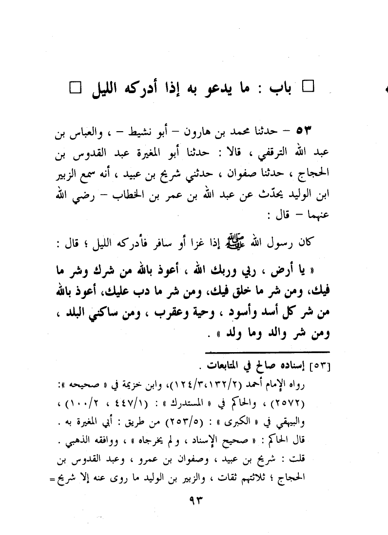 53 - حَدَّثَنَا مُحَمَّدُ بْنُ هَارُونَ أَبُو نَشِيطٍ، وَالْعَبَّاسُ بْنُ عَبْدِ اللَّهِ التَّرْقُفِيُّ قَالَا: حَدَّثَنَا أَبُو الْمُغِيرَةِ عَبْدُ الْقُدُّوسِ بْنِ الْحَجَّاجِ، حَدَّثَنَا صَفْوَانُ، حَدَّثَنِي شُرَيْحُ بْنُ عُبَيْدٍ، أَنَّهُ سَمِعَ الزُّبَيْرَ بْنَ الْوَلِيدِ، يُحَدِّثُ عَنْ عَبْدِ اللَّهِ بْنِ عُمَرَ بْنِ الْخَطَّابِ، رَضِيَ اللَّهُ عَنْهُمَا قَالَ: كَانَ رَسُولُ اللَّهِ صَلَّى اللهُ عَلَيْهِ وَسَلَّمَ §إِذَا غَزَا أَوْ سَافَرَ فَأَدْرَكَهُ اللَّيْلُ قَالَ: «يَا أَرْضُ، رَبِّي وَرَبُّكِ اللَّهُ، أَعُوذُ بِاللَّهِ مِنْ شَرِّكِ وَشَرِّ مَا فِيكِ، وَمِنْ شَرِّ مَا خَلَقَ فِيكِ، وَمِنْ شَرِّ مَا دَبَّ عَلَيْكِ، أَعُوذُ بِاللَّهِ مِنْ شَرِّ كُلِّ أَسَدٍ وَأَسْوَدَ، وَحَيَّةٍ وَعَقْرَبٍ، وَمِنْ سَاكِنِي الْبَلَدِ، وَمِنْ شَرِّ وَالِدٍ وَمَا وَلَدَ» -[95]-
