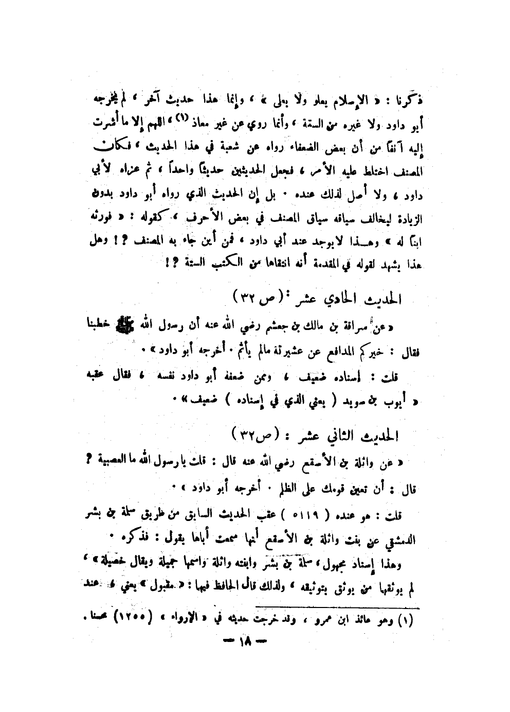 ذكرنا: «الإسلام يعلو ولا يعلى»، وإنما هذا حديث آخر، لم يخرجه أبو داود ولا غيره من الستة، وأنما روي عن غير معاذ (¬1)، اللهم إلا ما أشرت إليه آنفًا من أن بعض الضعفاء رواه عن شعبة في هذا الحديث، فكان المصنف اختلط عليه الأمر، فجعل الحديثين حديثًا واحدًا، ثم عزاه لأبي داود، ولا أصل لذلك عنده. بل إن الحديث الذي رواه أبو داود بدون الزيادة ليخالف سياقه سياق المصنف في بعض الأحرف، كقوله: «فورثه ابنًا له» وهذا لا يوجد عند أبي داود، فمن أين جاء به المصنف؟ ! وهل هذا يشهد لقوله في المقدمة أنه انتقاها من الكتب الستة؟ !