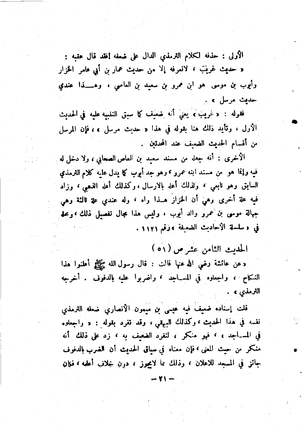الأخرى: أنه جعله من مسند سعيد بن العاص الصحابي، ولا دخل له فيه وإنما هو من مسند ابنه عمرو، وهو جد أيوب كما يدل عليه كلام الترمذي السابق وهو تابعي، ولذلك أعله بالإرسال، وكذلك أعله الذهبي، وزاد فيه علة أخرى وهي أن الخزاز هذا واه، وله عندي علة ثالثة وهي جهالة موسى بن عمرو والد أيوب، وليس هذا مجال تفصيل ذلك، ومحله في "سلسلة الأحاديث الضعيفة" رقم 1121.