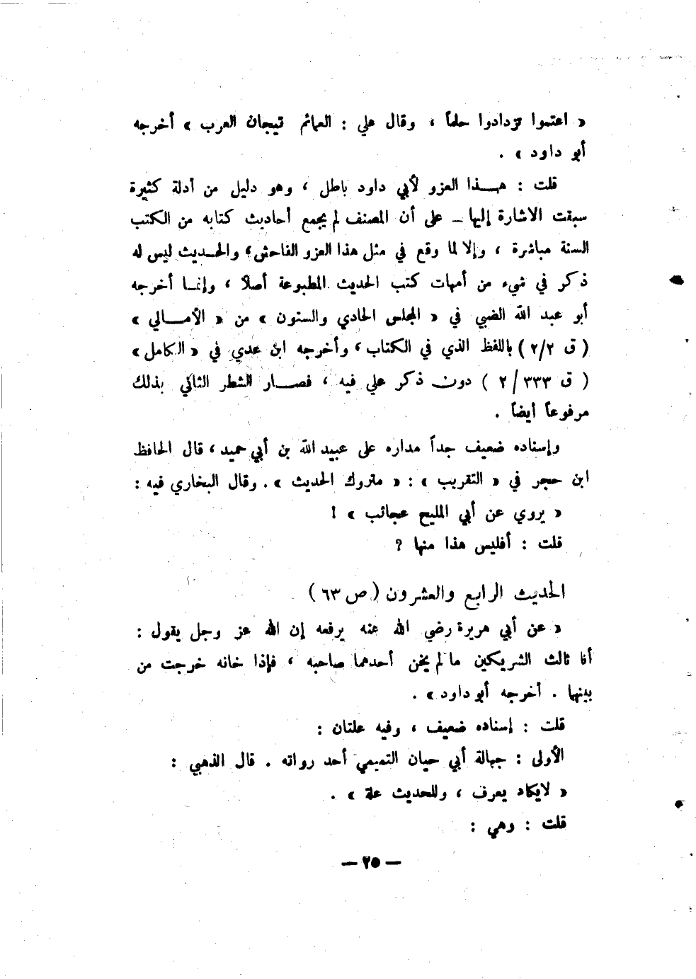 قلت: هذا العزو لأبي داود باطل، وهو دليل من أدلة كثيرة سبقت الإشارة إليها - على أن المصنف لم يجمع أحاديث كتابه من الكتب الستة مباشرة، وإلا لما وقع في مثل هذا العزو الفاحش، والحديث ليس له ذكر في شيء من أمهات كتب الحديث المطبوعة أصلًا، وإنما أخرجه أبو عبد الله الضبي في «المجلس الحادي والستون» من "الأمالي" (ق 2/ 2) باللفظ الذي في الكتاب، وأخرجه ابن عدي في "الكامل" (ق 333/ 2) دون ذكر علي فيه، فصار الشطر الثاني بذلك مرفوعًا أيضًا.