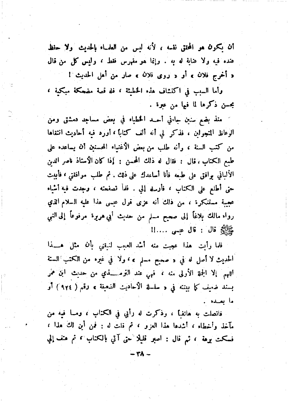 منذ بضع سنين جاءني أحد الخطباء في بعض مساجد دمشق ومن الوعاظ المتجولين، فذكر لي أنه ألف كتابًا، أورد فيه أحاديث انتقاها من كتب السنة، وأنه طلب من بعض الأغنياء المحسنين أن يساعده على طبع الكتاب، قال: فقال له ذلك المحسن: إذا كان الأستاذ ناصر الدين الألباني يوافق على طبعه فأنا أساعدك على ذلك. ثم طلب موافقتي، فأبيت حتى أطلع على الكتاب، فأرسله إلي. فلما تصفحته، وجدت فيه أشياء عجيبة مستنكرة، من ذلك أنه عزى قول عيسى هذا عليه السلام الذي رواه مالك بلاغًا إلى صحيح مسلم من حديث أبي هريرة مرفوعًا إلى النبي صلى الله عليه وسلم قال: قال