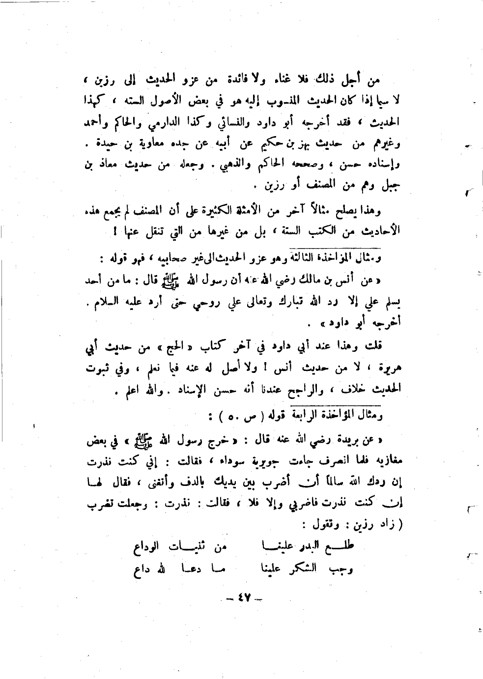 من أجل ذلك فلا غناء ولا فائدة من عزو الحديث إلى رزين، لا سيما إذا كان الحديث المنسوب إليه هو في بعض الأصول الستة، كهذا الحديث، فقد أخرجه أبو داود والنسائي وكذا الدارمي والحاكم وأحمد وغيرهم من حديث بهز بن حكيم عن أبيه عن جده معاوية بن حيدة. وإسناده حسن، وصححه الحاكم والذهبي. وجعله من حديث معاذ بن جبل وهم من المصنف أو رزين.