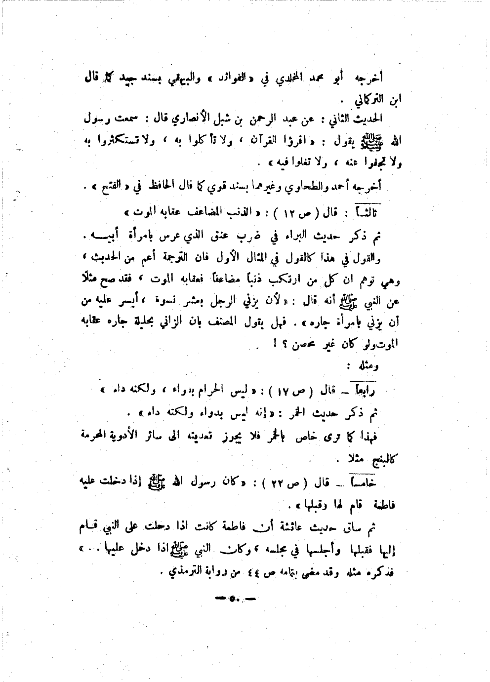 والقول في هذا كالقول في المثال الأول فإن الترجمة أعم من الحديث، وهي توهم أن كل من ارتكب ذنبًا مضاعفًا فعقابه الموت، فقد صح مثلًا عن النبي صلى الله عليه وسلم أنه قال: «لأن يزني الرجل بعشر نسوة، أيسر عليه من أن يزني بامرأة جاره». فهل يقول المصنف بأن الزاني بحليلة جاره عقابه الموت ولو كان غير محصن؟ !