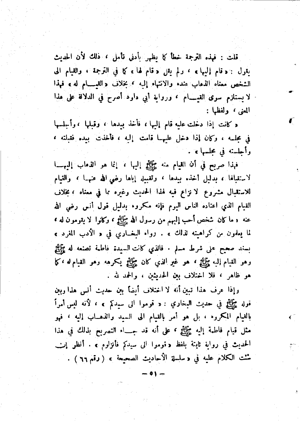 وإذا عرف هذا تبين أنه لا اختلاف أيضًا بين حديث أنس هذا وبين قوله صلى الله عليه وسلم في حديث البخاري: «قوموا إلى سيدكم»، لأنه ليس أمرًا بالقيام المكروه، بل هو أمر بالقيام إلى السيد والذهاب إليه، فهو مثل قيام فاطمة إليه صلى الله عليه وسلم، على أنه قد جاء التصريح بذلك في هذا الحديث في رواية ثابتة بلفظ «قوموا إلى سيدكم فأنزلوه». انظر إن شئت الكلام عليه في "سلسلة الأحاديث الصحيحة" (رقم 66).