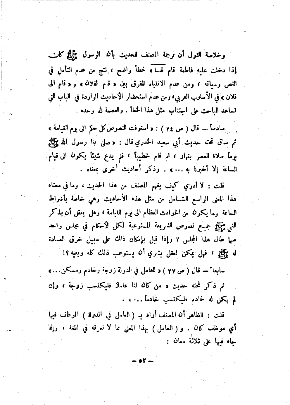 قلت: لا أدري كيف يفهم المصنف من هذا الحديث وما في معناه هذا المعنى الواسع الشامل، من مثل هذه الأحاديث وهي خاصة بأشراط الساعة وما يكون من الحوادث العظام إلى يوم القيامة، وهل يعقل أن يذكر النبي صلى الله عليه وسلم جميع نصوص الشريعة المستوعبة لكل الأحكام في مجلس واحد مهما طال هذا المجلس؟ وإذا قيل بإمكان ذلك على سبيل خرق العادة له صلى الله عليه وسلم، فهل يمكن لعقل بشري أن يستوعب ذلك كله ويعيه؟ !