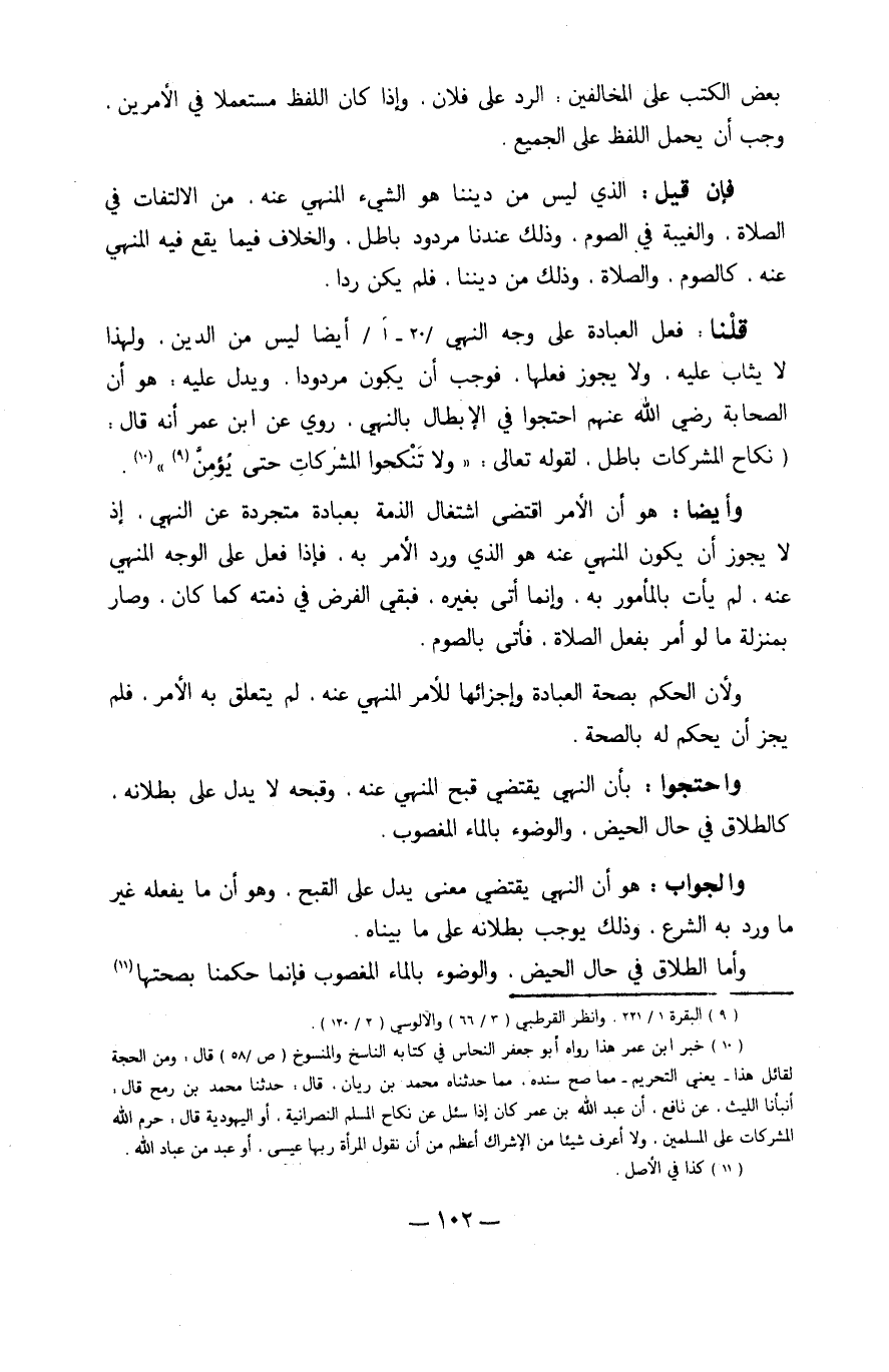 قُلْنَا فعل الْعِبَادَة على وَجه النَّهْي أَيْضا لَيْسَ من الدَّين وَلِهَذَا لَا يُثَاب عَلَيْهِ وَلَا يجوز فعلهَا فَوَجَبَ أَن يكون مردودا وَيدل عَلَيْهِ هُوَ أَن الصَّحَابَة رَضِي الله عَنْهُم احْتَجُّوا فِي الْإِبْطَال بِالنَّهْي رُوِيَ عَن ابْن عمر أَنه قَالَ نِكَاح المشركات بَاطِل لقَوْله تَعَالَى {وَلَا تنْكِحُوا المشركات حَتَّى يُؤمن}