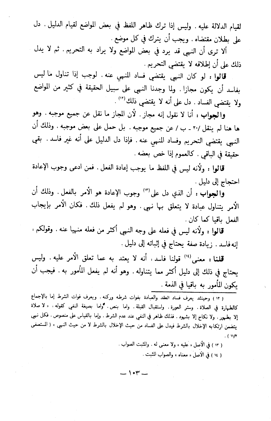 وَالْجَوَاب أَنا لَا نقُول إِنَّه مجَاز لِأَن الْمجَاز مَا نقل عَن جَمِيع مُوجبه وَهُوَ هَا هُنَا لم ينْقل عَن جَمِيع مُوجبه بل حمل على بعض مُوجبه وَذَلِكَ أَن النَّهْي يَقْتَضِي التَّحْرِيم وَفَسَاد الْمنْهِي عَنهُ فَإِذا دلّ الدَّلِيل على أَنه غير فَاسد بَقِي حَقِيقَة فِي الْبَاقِي كالعموم إِذا خص بعضه