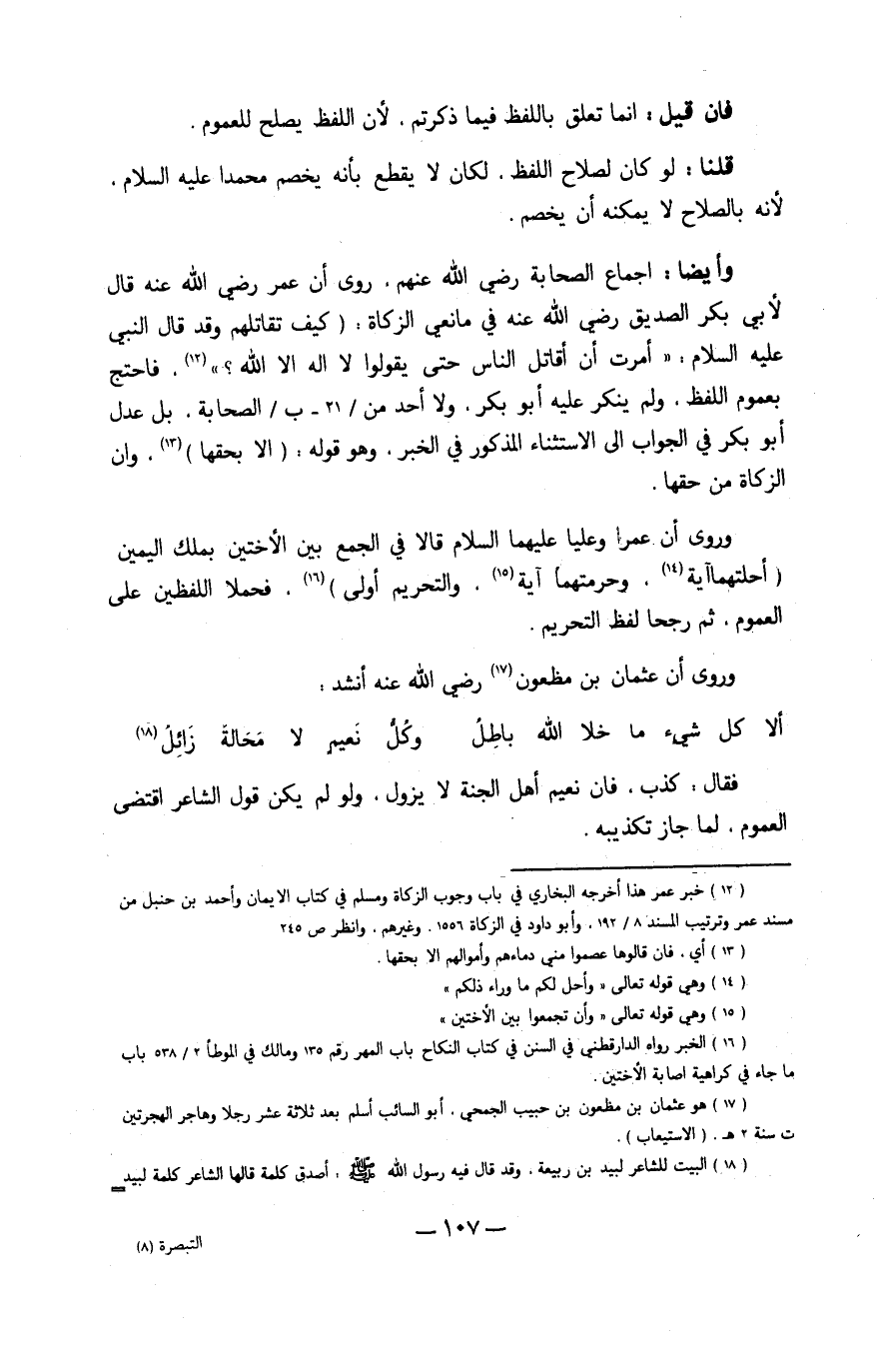 وَأَيْضًا إِجْمَاع الصَّحَابَة رَضِي الله عَنْهُم روى أَن عمر رَضِي الله عَنهُ قَالَ لأبي بكر الصّديق رَضِي الله عَنهُ فِي مانعي الزَّكَاة كَيفَ تقَاتلهمْ وَقد قَالَ النَّبِي عَلَيْهِ السَّلَام أمرت أَن أقَاتل النَّاس حَتَّى يَقُولُوا لَا إِلَه إِلَّا الله فاحتج بِعُمُوم اللَّفْظ وَلم يُنكر عَلَيْهِ أَبُو بكر وَلَا أحد من الصَّحَابَة بل عدل أَبُو بكر فِي الْجَواب إِلَى الِاسْتِثْنَاء الْمَذْكُور فِي الْخَبَر وَهُوَ قَوْله إِلَّا بِحَقِّهَا وَإِن الزَّكَاة من حَقّهَا