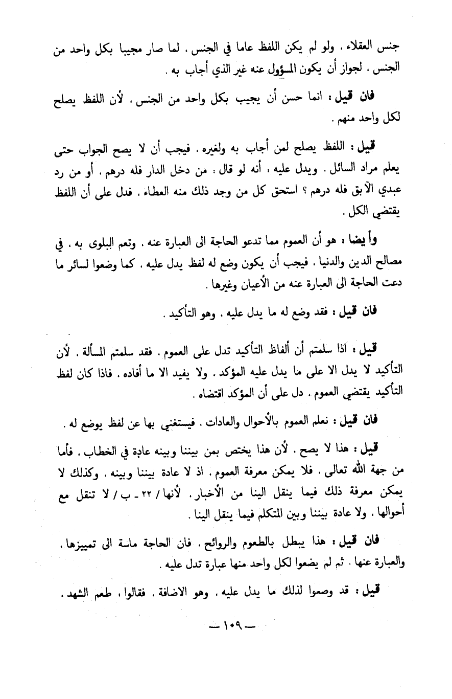 وَأَيْضًا هُوَ أَن الْعُمُوم مِمَّا تَدْعُو الْحَاجة إِلَى الْعبارَة عَنهُ وتعم الْبلوى بِهِ فِي مصَالح الدَّين وَالدُّنْيَا فَيجب أَن يكون وضع لَهُ لفظ يدل عَلَيْهِ كَمَا وضعُوا لسَائِر مَا دعت الْحَاجة إِلَى الْعبارَة عَنهُ من الْأَعْيَان وَغَيرهَا