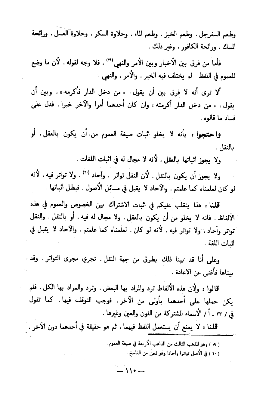 قُلْنَا هَذَا يَنْقَلِب عَلَيْكُم فِي إِثْبَات الِاشْتِرَاك بَين الْخُصُوص والعموم فِي هَذِه الْأَلْفَاظ فَإِنَّهُ لَا يَخْلُو من أَن يكون بِالْعقلِ وَلَا مجَال لَهُ فِيهِ أَو بِالنَّقْلِ وَالنَّقْل تَوَاتر وآحاد وَلَا تَوَاتر فِيهِ لِأَنَّهُ لَو كَانَ لعلمناه كَمَا علمْتُم والآحاد لَا يقبل فِي إِثْبَات اللُّغَة