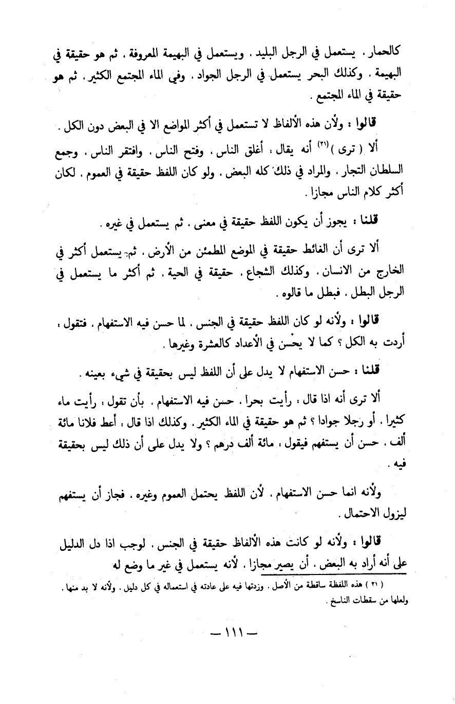أَلا ترى أَنه إِذا قَالَ رَأَيْت بحرا حسن فِيهِ الِاسْتِفْهَام بِأَن تَقول رَأَيْت مَاء كثيرا أَو رجلا جوادا ثمَّ هُوَ حَقِيقَة فِي المَاء الْكثير وَكَذَلِكَ إِذا قَالَ أعْط فلَانا مائَة ألف حسن أَن يستفهم فَيَقُول مائَة ألف دِرْهَم وَلَا يدل على أَن ذَلِك لَيْسَ بِحَقِيقَة فِيهِ