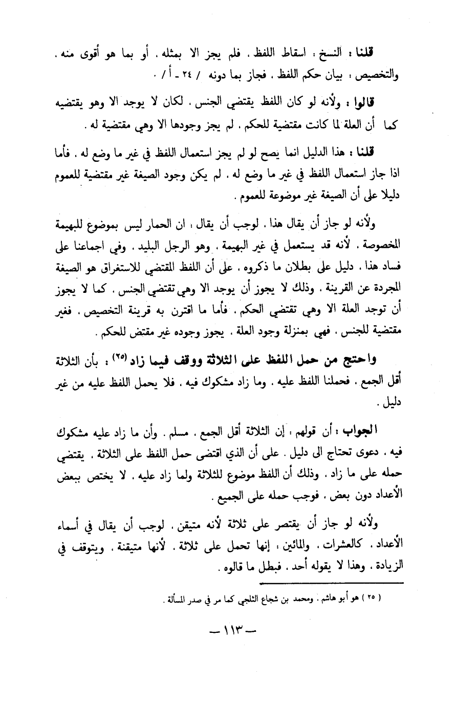 الْجَواب أَن قَوْلهم إِن الثَّلَاثَة أقل الْجمع مُسلم وَأَن مَا زَاد عَلَيْهِ مَشْكُوك فِيهِ دَعْوَى تحْتَاج إِلَى دَلِيل على أَن الَّذِي اقْتضى حمل اللَّفْظ على الثَّلَاثَة يَقْتَضِي حمله على مَا زَاد وَذَلِكَ أَن اللَّفْظ مَوْضُوع للثَّلَاثَة وَلما زَاد عَلَيْهِ لَا يخْتَص بِبَعْض الْأَعْدَاد دون بعض فَوَجَبَ حمله على الْجَمِيع