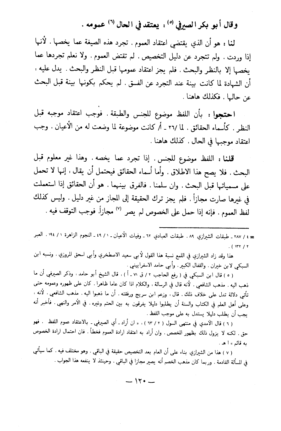 وَقَالَ أَبُو بكر الصَّيْرَفِي يعْتَقد فِي الْحَال عُمُومه