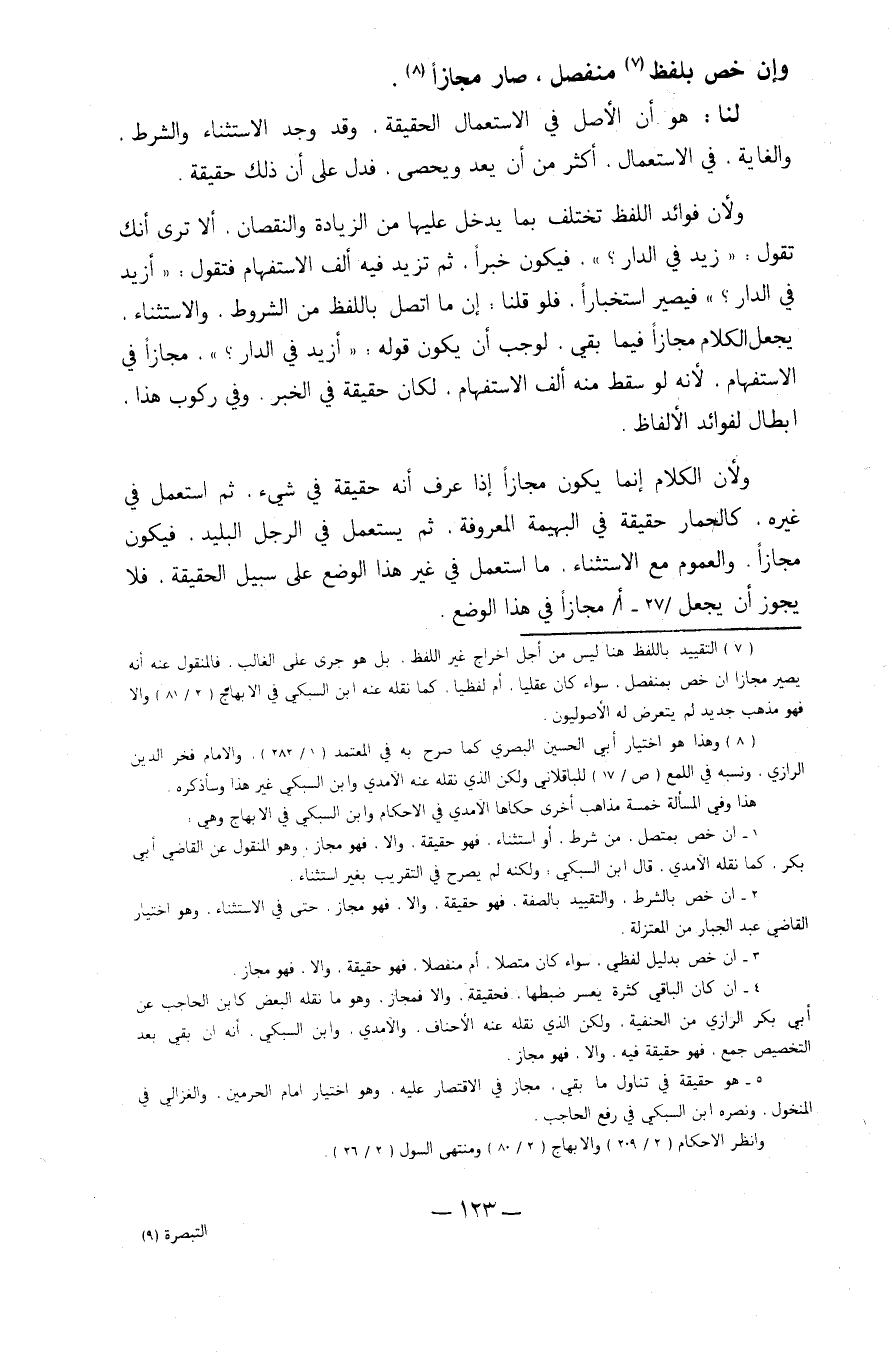 وَلِأَن فَوَائِد اللَّفْظ تخْتَلف بِمَا يدْخل عَلَيْهَا من الزِّيَادَة وَالنُّقْصَان أَلا ترى أَنَّك تَقول زيد فِي الدَّار فَيكون خَبرا ثمَّ تزيد فِيهِ ألف الِاسْتِفْهَام فَتَقول أَزِيد فِي الدَّار فَيصير استخبارا فَلَو قُلْنَا إِن مَا اتَّصل بِاللَّفْظِ من الشُّرُوط وَالِاسْتِثْنَاء يَجْعَل الْكَلَام مجَازًا فِيمَا بَقِي لوَجَبَ أَن يكون قَوْله أَزِيد فِي الدَّار حجازا فِي الِاسْتِفْهَام لِأَنَّهُ لَو سقط مِنْهُ ألف الِاسْتِفْهَام لَكَانَ حَقِيقَة فِي الْخَبَر وَفِي ركُوب هَذَا إبِْطَال لفوائد الْأَلْفَاظ