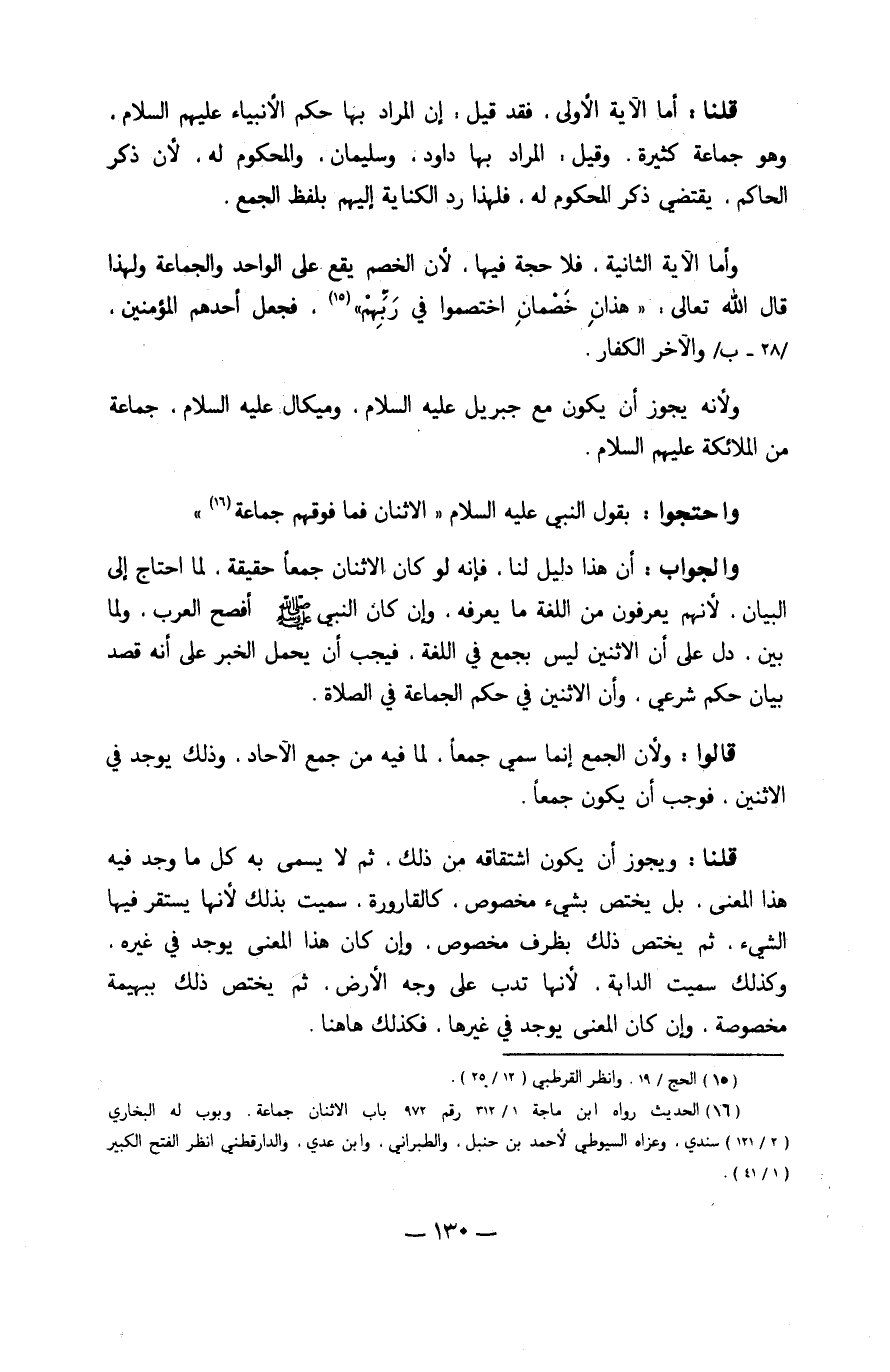 وَالْجَوَاب أَن هَذَا دَلِيل لنا فَإِنَّهُ لَو كَانَ الِاثْنَان جمعا حَقِيقَة لما احْتَاجَ إِلَى الْبَيَان لأَنهم يعْرفُونَ من اللُّغَة مَا يعرفهُ وَإِن كَانَ النَّبِي صلى الله عَلَيْهِ وَسلم أفْصح الْعَرَب وَلما بَين دلّ على أَن الِاثْنَيْنِ لَيْسَ بِجمع فِي اللُّغَة فَيجب أَن يحمل الْخَبَر على أَنه قصد بَيَان حكم شَرْعِي وَأَن الِاثْنَيْنِ فِي حكم الْجَمَاعَة فِي الصَّلَاة