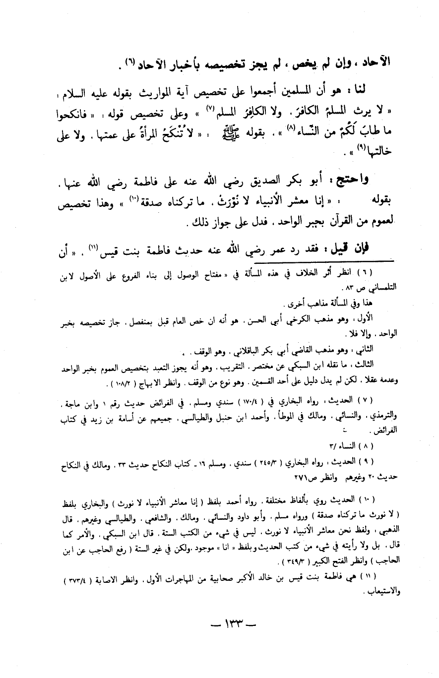 وَاحْتج أَبُو بكر الصّديق رَضِي الله عَنهُ على فَاطِمَة رَضِي الله عَنْهَا بقوله صلى الله عَلَيْهِ وَسلم إِنَّا معشر الْأَنْبِيَاء لَا نورث مَا تَرَكْنَاهُ صَدَقَة وَهَذَا تَخْصِيص لعُمُوم من الْقُرْآن بجبر الْوَاحِد فَدلَّ على جَوَاز ذَلِك