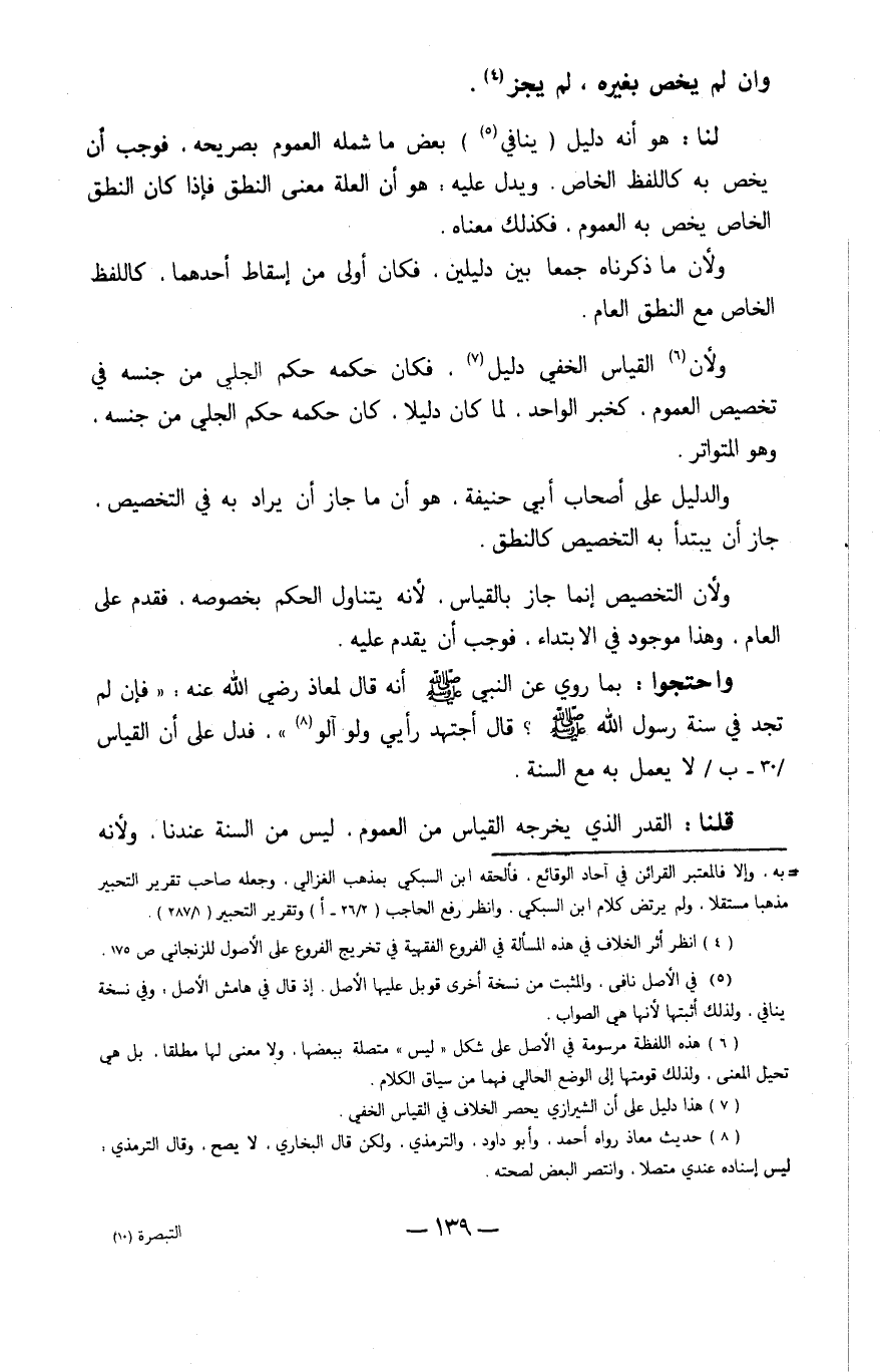 لنا هُوَ أَنه دَلِيل يُنَافِي بعض مَا شَمله الْعُمُوم بصريحه فَوَجَبَ أَن يخص بِهِ كاللفظ الْخَاص وَيدل عَلَيْهِ هُوَ أَن الْعلَّة معنى النُّطْق فَإِذا كَانَ النُّطْق الْخَاص يخص بِهِ الْعُمُوم فَكَذَلِك مَعْنَاهُ