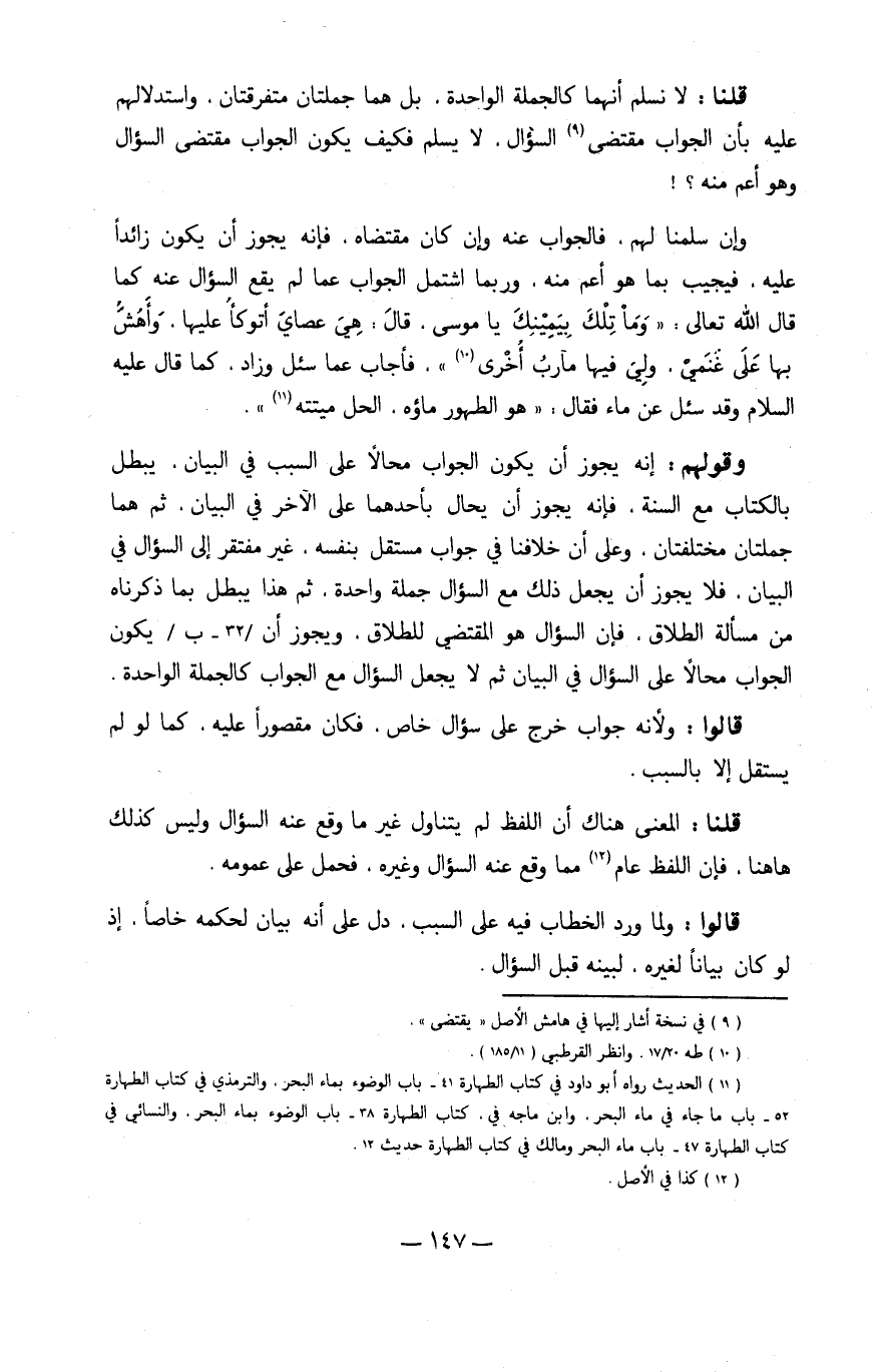 وَإِن سلمنَا لَهُم فَالْجَوَاب عَنهُ وَإِن كَانَ مُقْتَضَاهُ فَإِنَّهُ يجوز أَن يكون زَائِدا عَلَيْهِ فيجيب بِمَا هُوَ أَعم مِنْهُ وَرُبمَا اشْتَمَل الْجَواب عَمَّا لم يَقع السُّؤَال عَنهُ كَمَا قَالَ الله تَعَالَى {وَمَا تِلْكَ بيمينك يَا مُوسَى قَالَ هِيَ عصاي أتوكأ عَلَيْهَا وأهش بهَا على غنمي ولي فِيهَا مآرب أُخْرَى} فَأجَاب عَمَّا سُئِلَ وَزَاد كَمَا قَالَ عَلَيْهِ السَّلَام وَقد سُئِلَ عَن مَاء فَقَالَ هُوَ الطّهُور مَاؤُهُ الْحل ميتَته