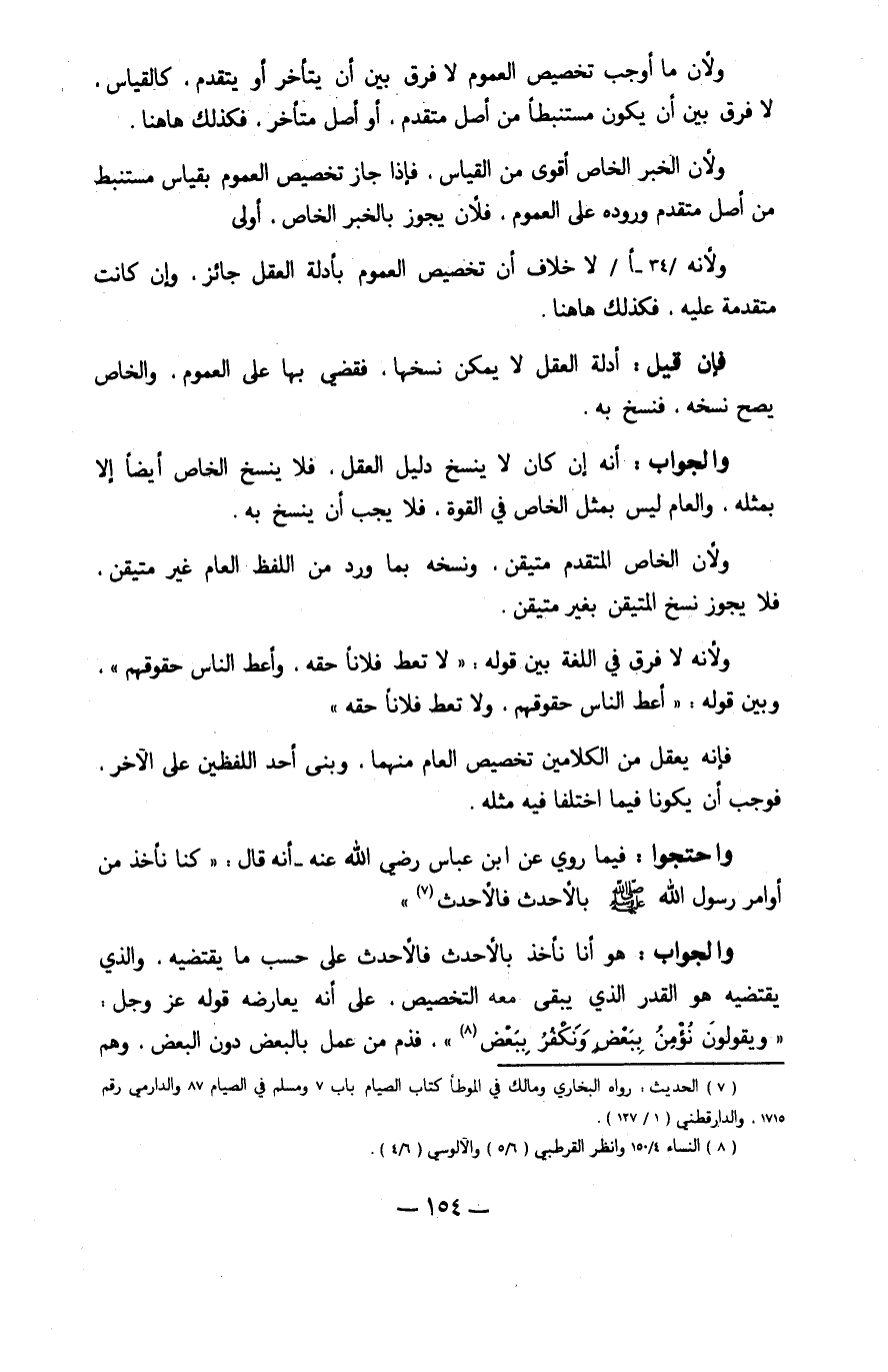 وَالْجَوَاب أَنه إِن كَانَ لَا ينْسَخ دَلِيل الْعقل فَلَا ينْسَخ الْخَاص أَيْضا إِلَّا بِمثلِهِ وَالْعَام لَيْسَ مثل الْخَاص فِي الْقُوَّة فَلَا يجب أَن ينْسَخ بِهِ