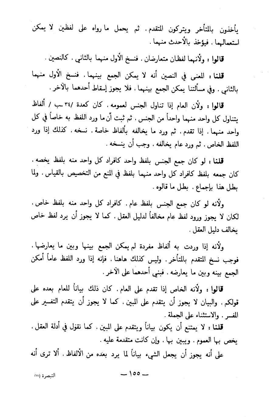 وَلِأَنَّهُ إِذا وَردت بِهِ أَلْفَاظ مُفْردَة لم يكن الْجمع بَينهَا وَبَين مَا يعارضها فَوَجَبَ نسخ الْمُتَقَدّم بالمتأخر وَلَيْسَ كَذَلِك هَاهُنَا فَإِنَّهُ إِذا ورد اللَّفْظ عَاما أمكن الْجمع بَينه وَبَين مَا يُعَارضهُ فَبنِي أَحدهمَا على الآخر