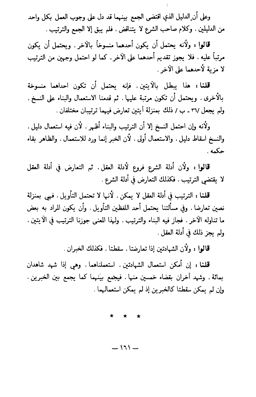 قُلْنَا التَّرْتِيب فِي أَدِلَّة الْعقل لَا يُمكن لِأَنَّهَا لَا تحْتَمل التَّأْوِيل فَهِيَ بِمَنْزِلَة نصين تَعَارضا وَفِي مَسْأَلَتنَا يحْتَمل أحد اللَّفْظَيْنِ التَّأْوِيل وَأَن يكون المُرَاد بِهِ بعض مَا تنَاوله الآخر فَجَاز فِيهِ الْبناء وَالتَّرْتِيب وَلِهَذَا الْمَعْنى جَوَّزنَا التَّرْتِيب فِي الْآيَتَيْنِ وَلم يجز ذَلِك فِي أَدِلَّة الْعقل