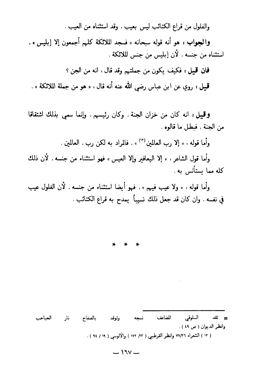 وَأما قَوْله وَلَا عيب فيهم فَهُوَ أَيْضا اسْتثِْنَاء من جنسه لِأَن الفلول عيب فِي نَفسه وَإِن كَانَ قد جعل ذَلِك نسيبا يمدح بِهِ قراع الْكَتَائِب