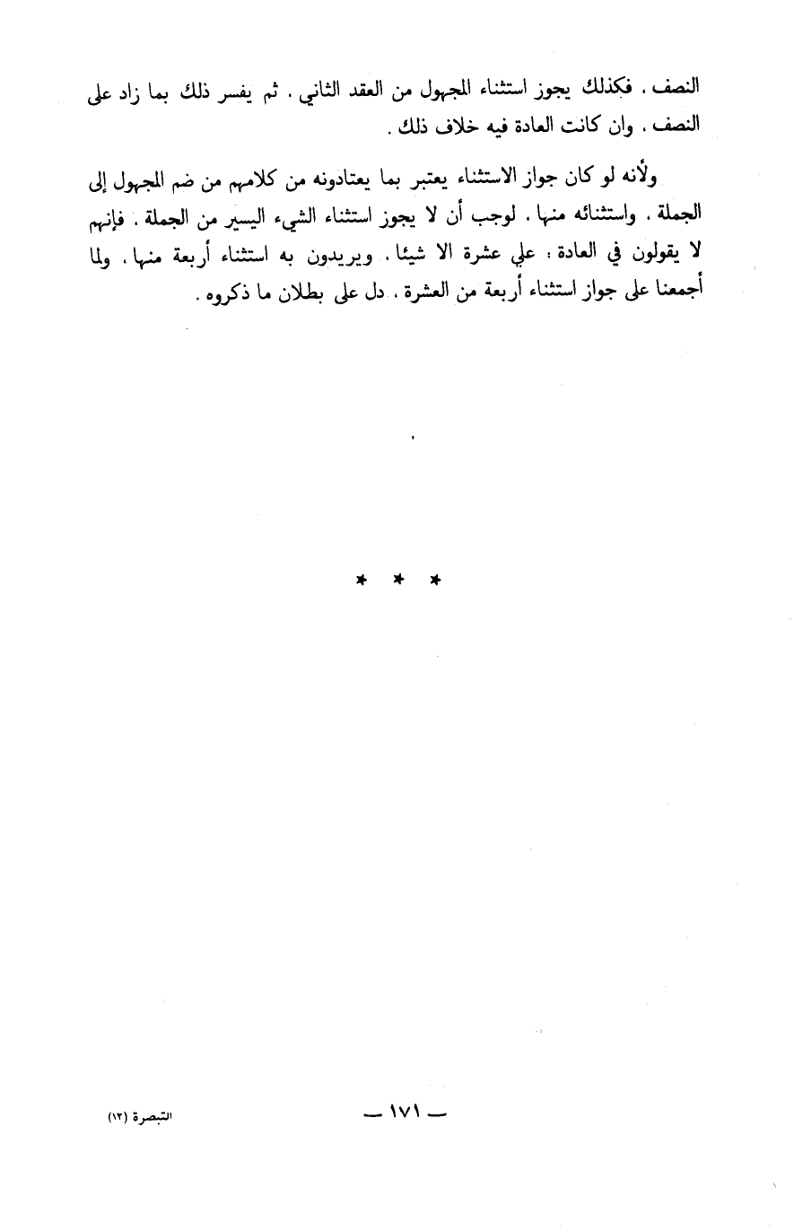 وَلِأَنَّهُ لَو كَانَ جَوَاز الِاسْتِثْنَاء يعْتَبر بِمَا يعتادونه من كَلَامهم من ضم الْمَجْهُول إِلَى الْجُمْلَة واستثنائه مِنْهَا لوَجَبَ أَن لَا يجوز اسْتثِْنَاء الشَّيْء الْيَسِير من الْجُمْلَة فَإِنَّهُم لَا يَقُولُونَ فِي الْعَادة عَليّ عشرَة إِلَّا شَيْئا ويريدون بِهِ اسْتثِْنَاء أَرْبَعَة مِنْهَا وَلما أجمعنا على جَوَاز اسْتثِْنَاء أَرْبَعَة من الْعشْرَة دلّ على بطلَان مَا ذَكرُوهُ