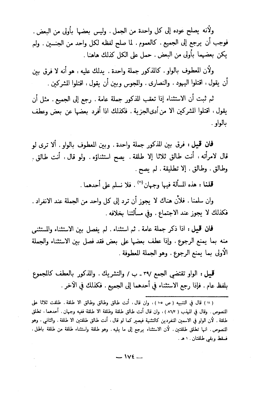 ثمَّ ثَبت أَن الِاسْتِثْنَاء إِذا تعقب الْمَذْكُور جملَة عَامَّة رَجَعَ إِلَى الْجَمِيع مثل أَن يَقُول اقْتُلُوا الْمُشْركين إِلَّا من أدّى الْجِزْيَة فَكَذَلِك إِذا أفرد بَعْضهَا عَن بعض وَعطف بِالْوَاو