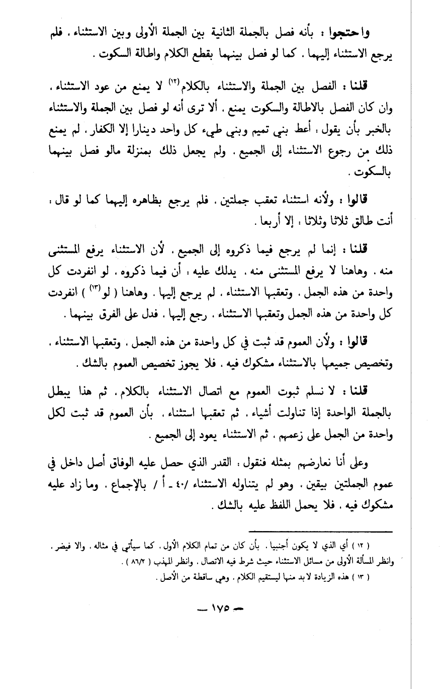 قُلْنَا لَا نسلم ثُبُوت الْعُمُوم مَعَ اتِّصَال الِاسْتِثْنَاء بالْكلَام ثمَّ هَذَا يبطل بِالْجُمْلَةِ الْوَاحِدَة إِذا تناولت أَشْيَاء ثمَّ تعقبها اسْتثِْنَاء بِأَن الْعُمُوم قد ثَبت لكل وَاحِدَة من الْجمل على زعمهم ثمَّ الِاسْتِثْنَاء يعود إِلَى الْجَمِيع