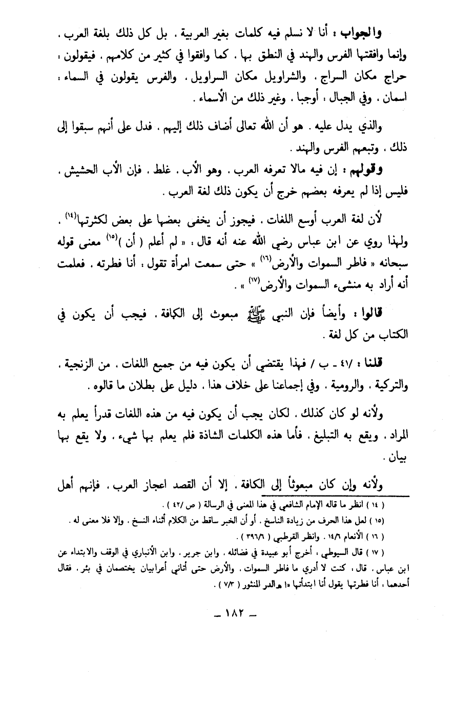 وَالْجَوَاب أَنا لَا نسلم فِيهِ كَلِمَات بِغَيْر الْعَرَبيَّة بل كل ذَلِك بلغَة الْعَرَب وَإِنَّمَا وافقتها الْفرس والهند فِي النُّطْق بهَا كَمَا وافقوا فِي كثير من كَلَامهم فَيَقُولُونَ حراج مَكَان السراج والشراويل مَكَان السَّرَاوِيل وَالْفرس يَقُولُونَ فِي السَّمَاء اسمان وَفِي الْجبَال أوجبا وَغير ذَلِك من الْأَسْمَاء