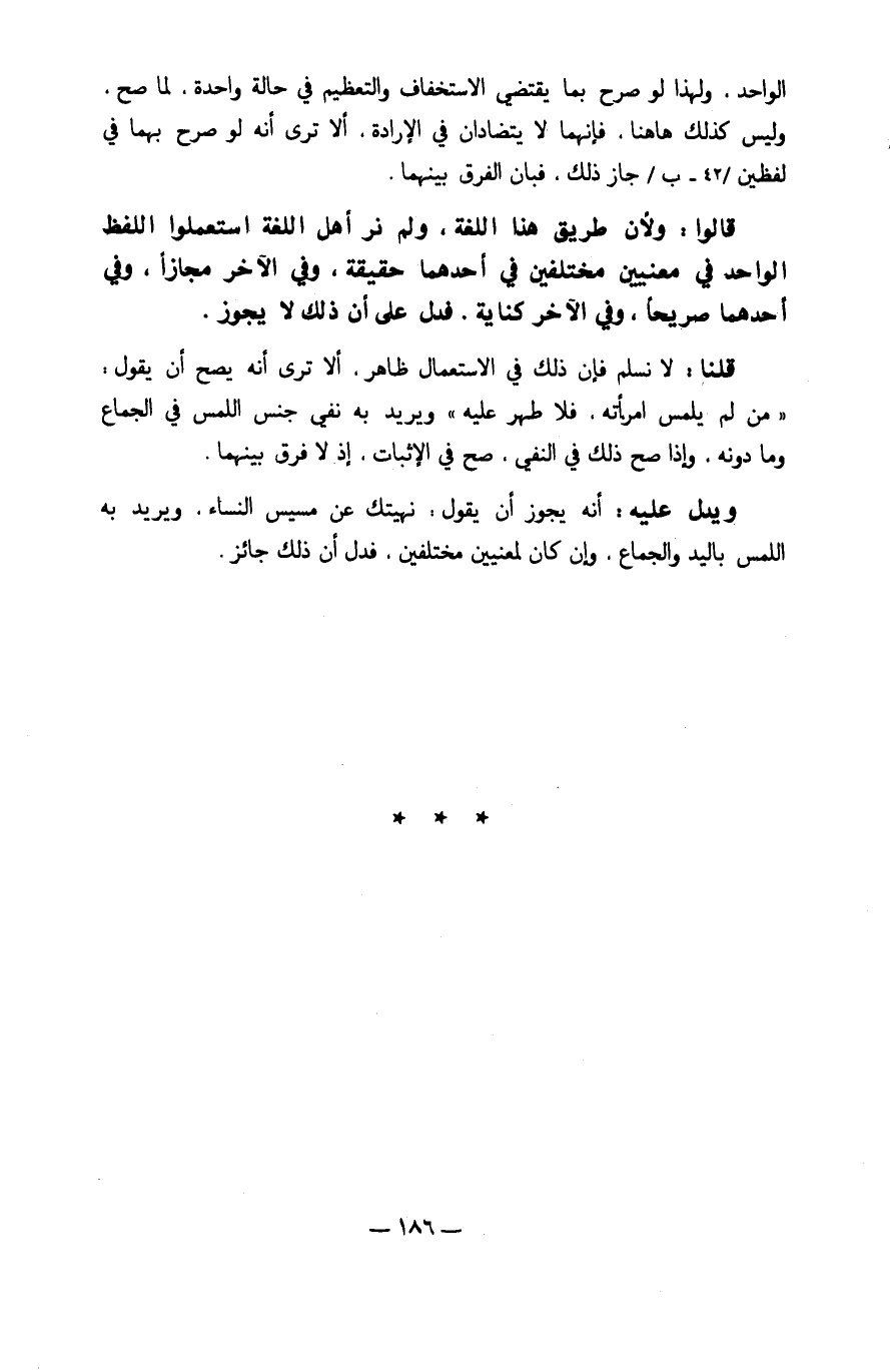 قَالُوا وَلِأَن طَرِيق هَذَا اللُّغَة وَلم نر أهل اللُّغَة استعملوا اللَّفْظ الْوَاحِد فِي مَعْنيين مُخْتَلفين فِي أَحدهمَا حَقِيقَة وَفِي الآخر مجَازًا وَفِي أَحدهمَا صَرِيحًا وَفِي الآخركناية فَدلَّ على أَن ذَلِك لَا يجوز