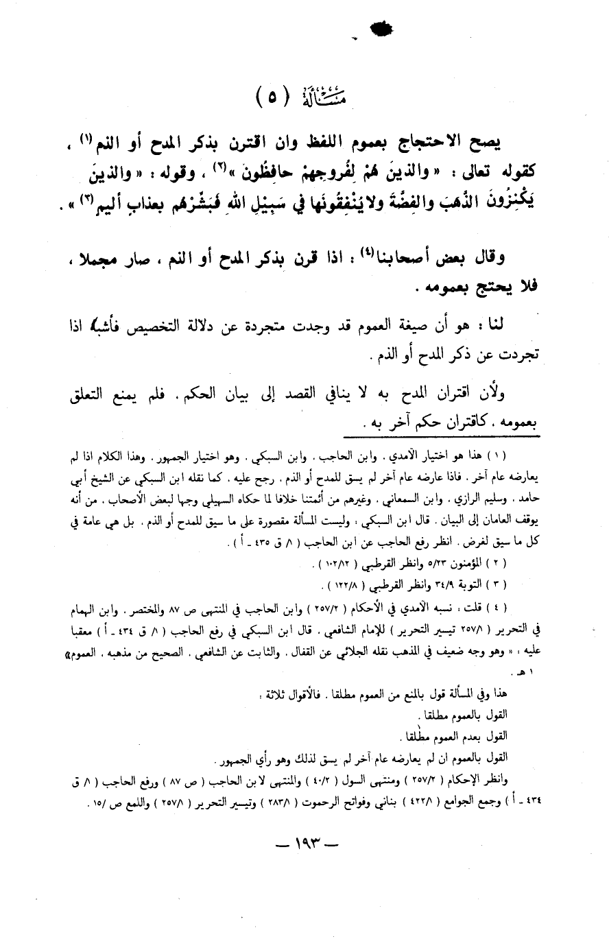 يَصح الِاحْتِجَاج بِعُمُوم اللَّفْظ وَإِن اقْترن بِذكر الْمَدْح أَو الذَّم كَقَوْلِه تَعَالَى {وَالَّذين هم لفروجهم حافظون} وَقَوله {وَالَّذين يكنزون الذَّهَب وَالْفِضَّة وَلَا يُنْفِقُونَهَا فِي سَبِيل الله فبشرهم بِعَذَاب أَلِيم}