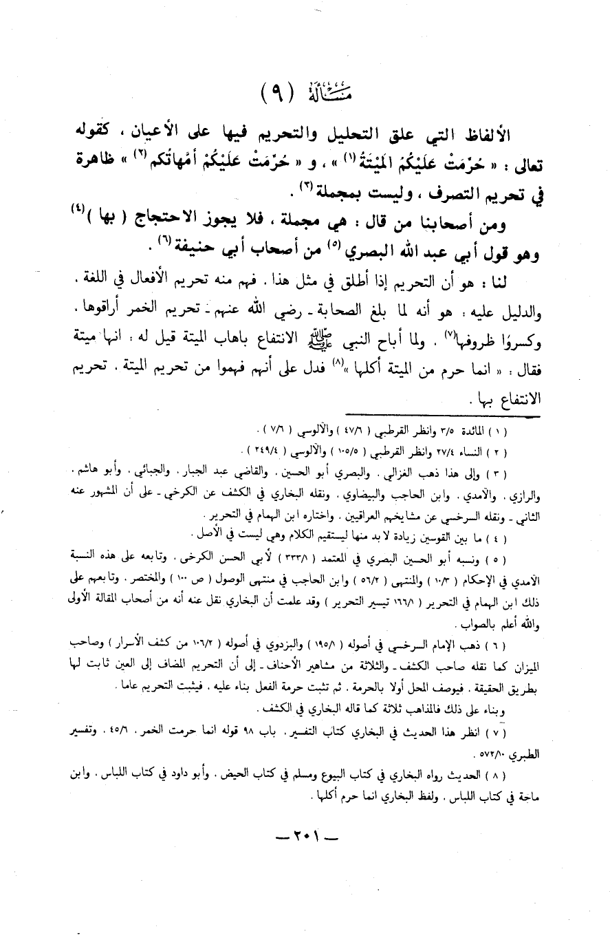 الْأَلْفَاظ الَّتِي علق التَّحْلِيل وَالتَّحْرِيم فِيهَا على الْأَعْيَان كَقَوْلِه تَعَالَى {حرمت عَلَيْكُم الْميتَة} و {حرمت عَلَيْكُم أُمَّهَاتكُم} ظَاهِرَة فِي تَحْرِيم التَّصَرُّف وَلَيْسَت بمجملة