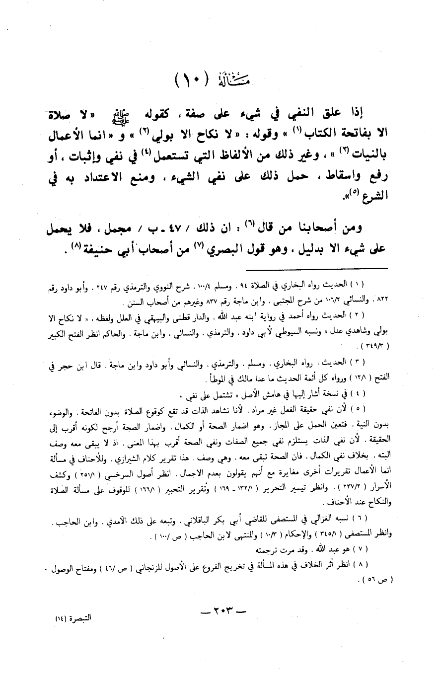 إِذا علق النَّفْي فِي شَيْء على صفة كَقَوْلِه صلى الله عَلَيْهِ وَسلم لَا صَلَاة إِلَّا بِفَاتِحَة الْكتاب وَقَوله لَا نِكَاح إِلَّا بولِي وإِنَّمَا الْأَعْمَال بِالنِّيَّاتِ وَغير ذَلِك من الْأَلْفَاظ الَّتِي تسْتَعْمل فِي نفي وَإِثْبَات أَو رفع وَإِسْقَاط حمل ذَلِك على نفي الشَّيْء وَمنع الِاعْتِدَاد بِهِ فِي الشَّرْع