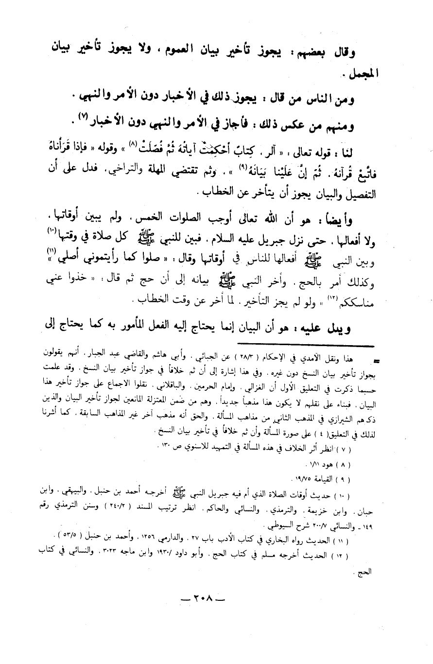 لنا قَوْله تَعَالَى {الر كتاب أحكمت آيَاته ثمَّ فصلت} وَقَوله {فَإِذا قرأناه فَاتبع قرآنه ثمَّ إِن علينا بَيَانه} وَثمّ تَقْتَضِي المهلة والتراخي فَدلَّ على أَن التَّفْصِيل وَالْبَيَان يجوز أَن يتَأَخَّر عَن الْخطاب