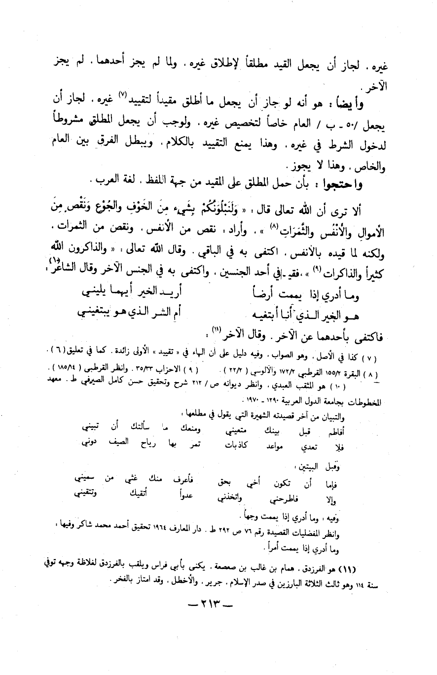 أَلا ترى أَن الله تَعَالَى قَالَ {ولنبلونكم بِشَيْء من الْخَوْف والجوع وَنقص من الْأَمْوَال والأنفس والثمرات} وَأَرَادَ نقص من الْأَنْفس وَنقص من الثمرات وَلكنه لما قَيده بالأنفس اكْتفى بِهِ فِي الْبَاقِي وَقَالَ الله تَعَالَى {والذاكرين الله كثيرا وَالذَّاكِرَات} فقيافي أحد الجنسين وَاكْتفى بِهِ فِي الْجِنْس الآخر وَقَالَ الشَّاعِر