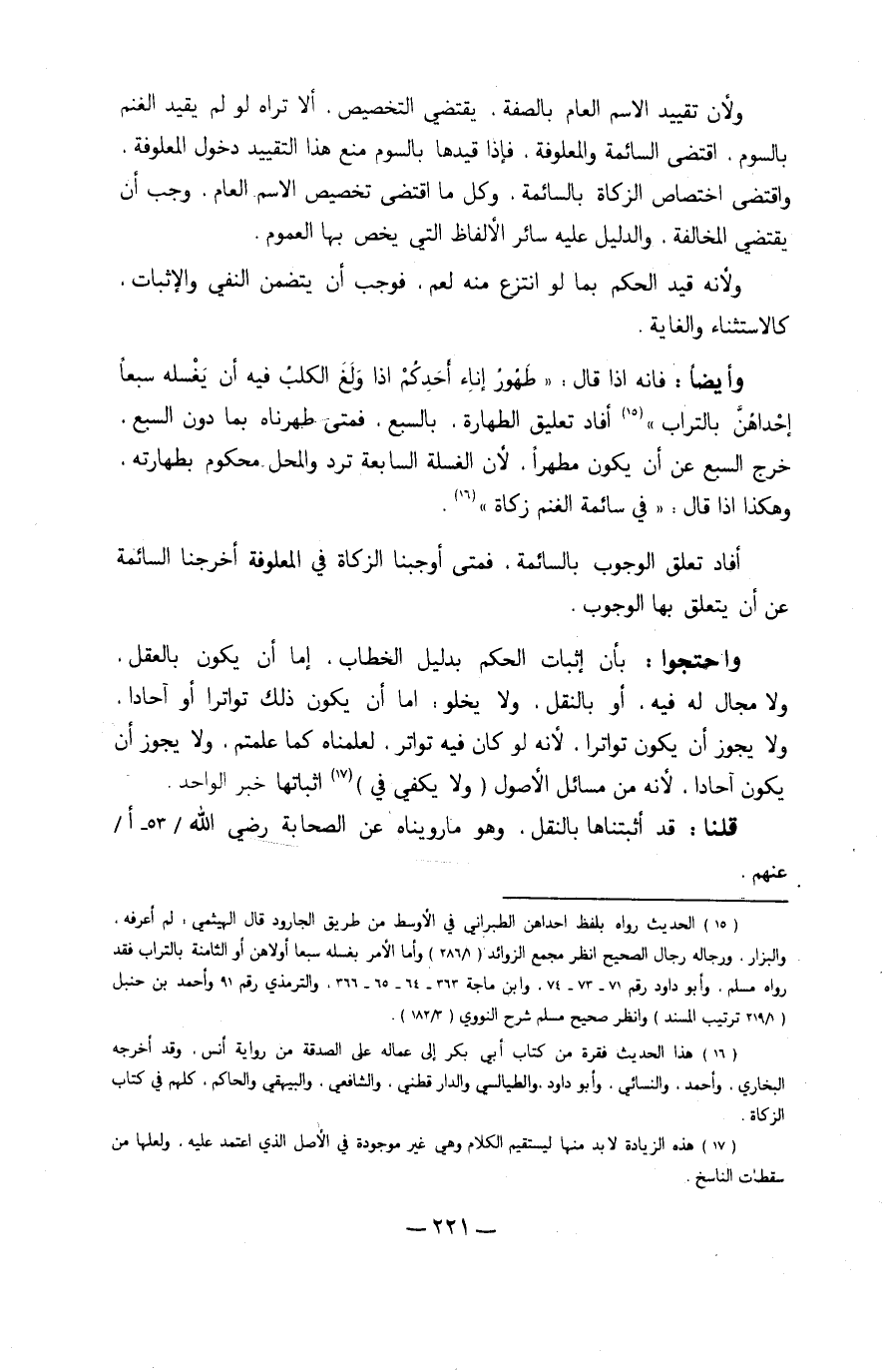 وَأَيْضًا فَإِنَّهُ إِذا قَالَ طهُور إِنَاء أحدكُم إِذا ولغَ الْكَلْب فِيهِ أَن يغسلهُ سبعا إِحْدَاهُنَّ بِالتُّرَابِ أَفَادَ تَعْلِيق الطَّهَارَة بالسبع فَمَتَى طهرناه بِمَا دون السَّبع خرج السَّبع عَن أَن يكون مطهرا لِأَن الغسلة السَّابِعَة ترد وَالْمحل مَحْكُوم بِطَهَارَتِهِ وَهَكَذَا إِذا قَالَ فِي سَائِمَة الْغنم زَكَاة