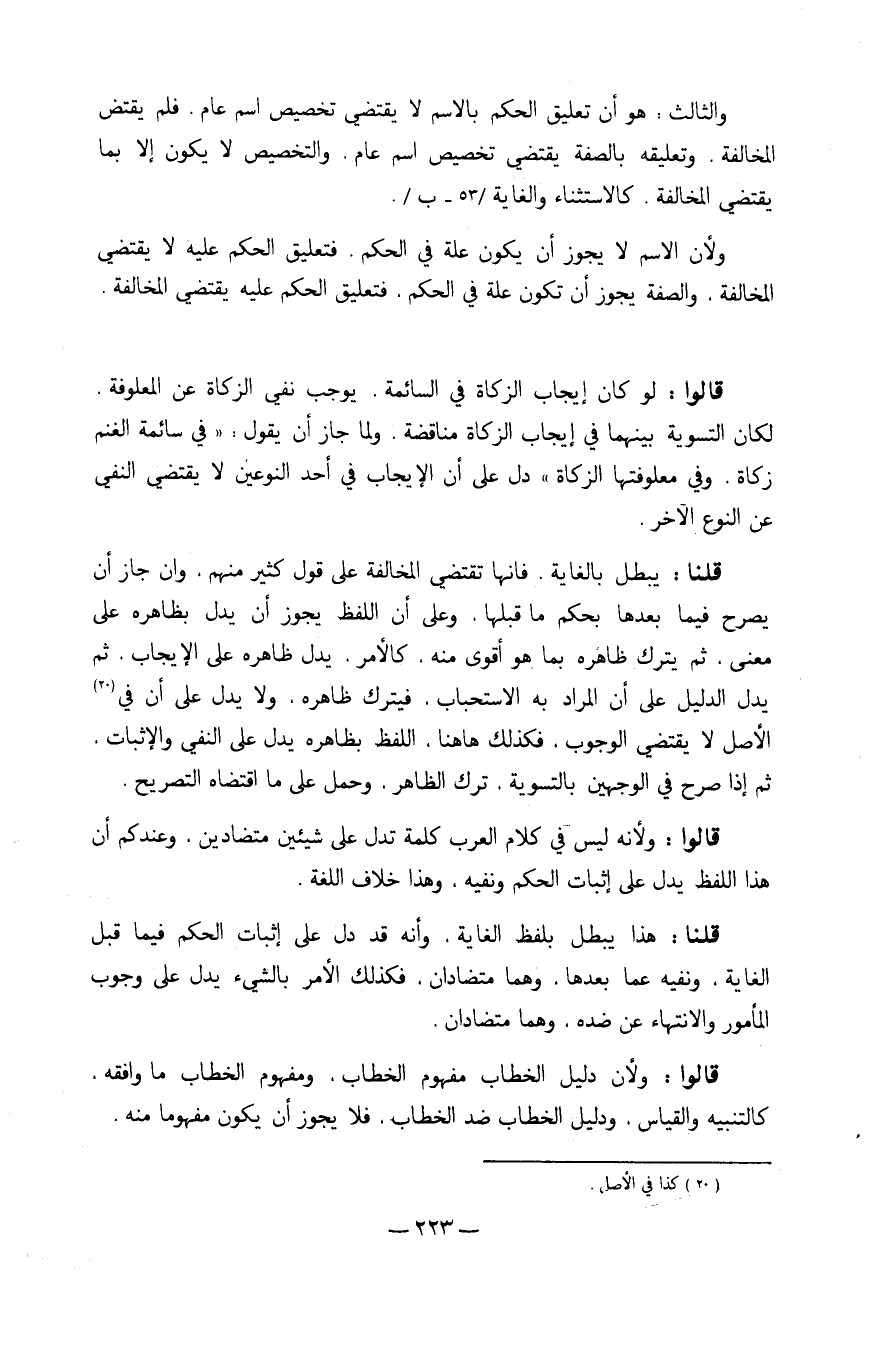 قَالُوا لَو كَانَ إِيجَاب الزَّكَاة فِي السَّائِمَة يُوجب نفي الزَّكَاة عَن المعلوفة لَكَانَ التَّسْوِيَة بَينهمَا فِي إِيجَاب الزَّكَاة مناقضة وَلما جَازَ أَن يَقُول فِي سَائِمَة الْغنم زَكَاة وَفِي معلوفتها الزَّكَاة دلّ على أَن الْإِيجَاب فِي أحد النَّوْعَيْنِ لَا يَقْتَضِي النَّفْي عَن النَّوْع الآخر